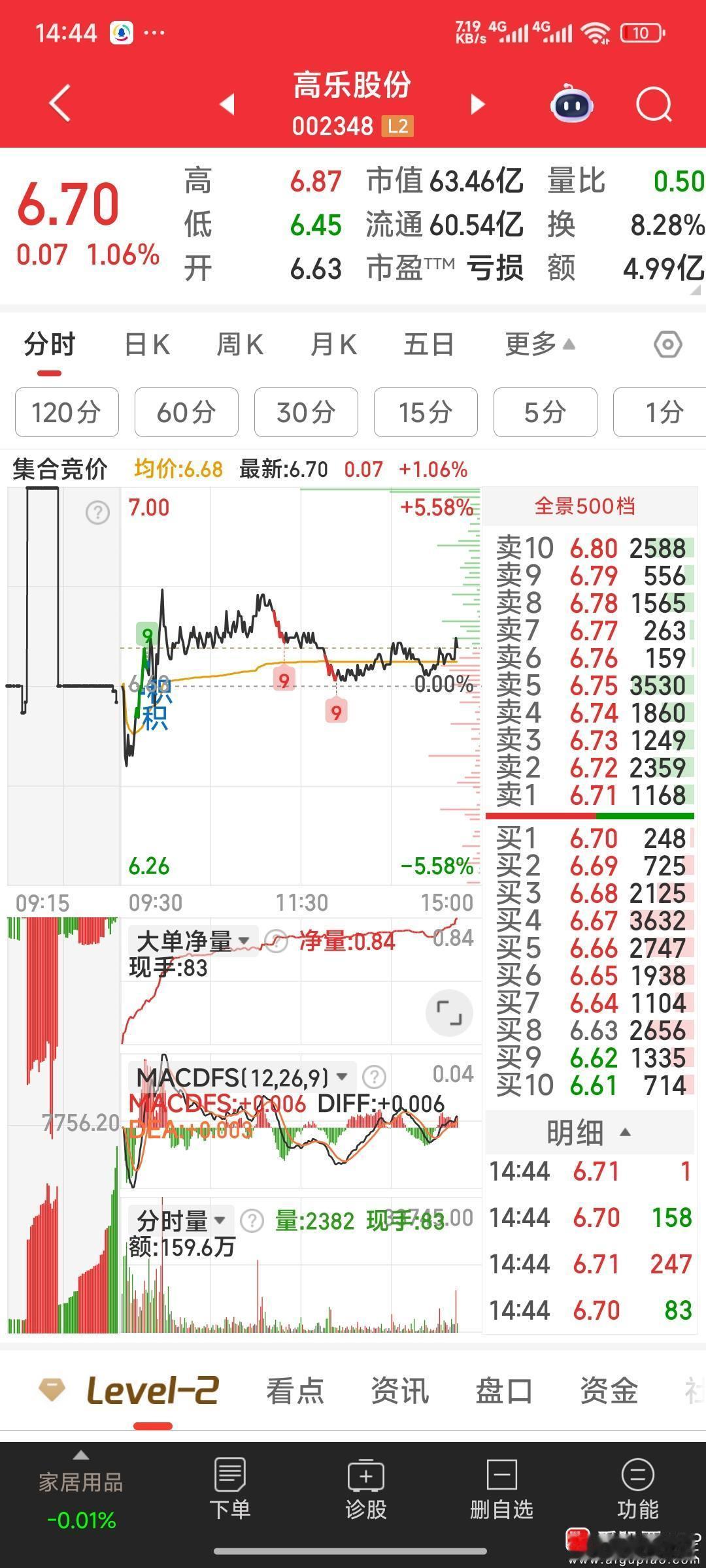收盘了,今天没达到预期值,明天继续观战。现手中共5牛:高乐股份,安妮股份,孚日股