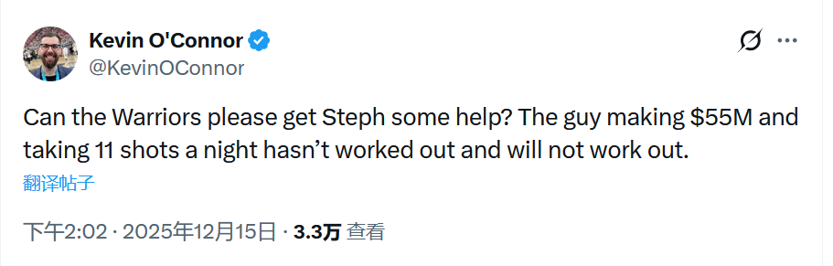 奥康纳:勇士能不能给库里整点靠谱帮手啊?那个人拿着5500万美元年薪,每晚却只出手11次,这打法早就行不通了,以后也绝不会行得通。NBA