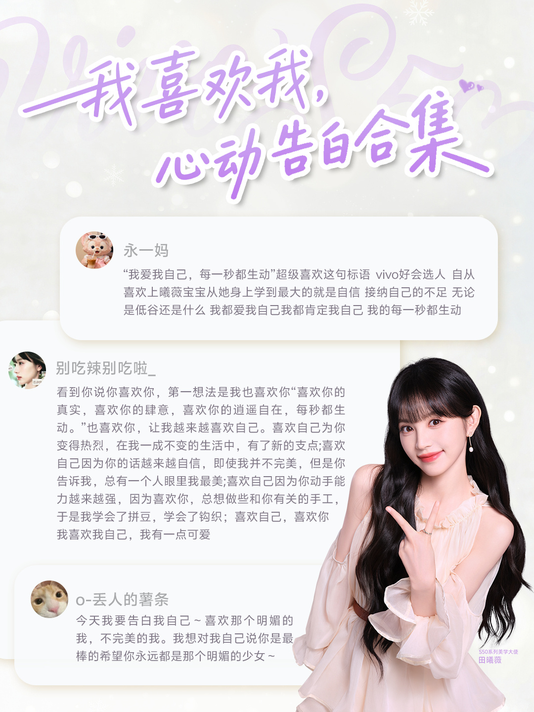 田曦薇认领薇我S50vivo S50系列发布了,欢迎大家薇我S50哈哈~不得不说,田曦薇作为这次vivo S50系列的美学大使真的太搭了,换装两度登台真的好评!而且这次的S50系列专门给年轻人做了相当多的功能,不仅有5000万像素索尼大底潜望长焦,还有3种大师Live运镜,6大创意Live特效,N种胶片滤镜……不管拍景拍物还是拍人,都足够游刃有余,轻松拿捏~尤其vivo S50 Pro mini更是全能,各方面都是满配,6.31英寸轻薄小直屏搭配第五代骁龙8芯片更是一绝,这台机型我真的强烈推荐。两台机型都做到了轻薄好看又好用,vivo是真的懂年轻人想要什么的。还有这次的「告白」配色我是真的爱!!PS:vivo S50系列联合田曦薇对自己的告白也很契合大家最近都在说的“爱你老己”!自我关怀具象化了!vivo是真的会玩,做产品也是真的用心……
