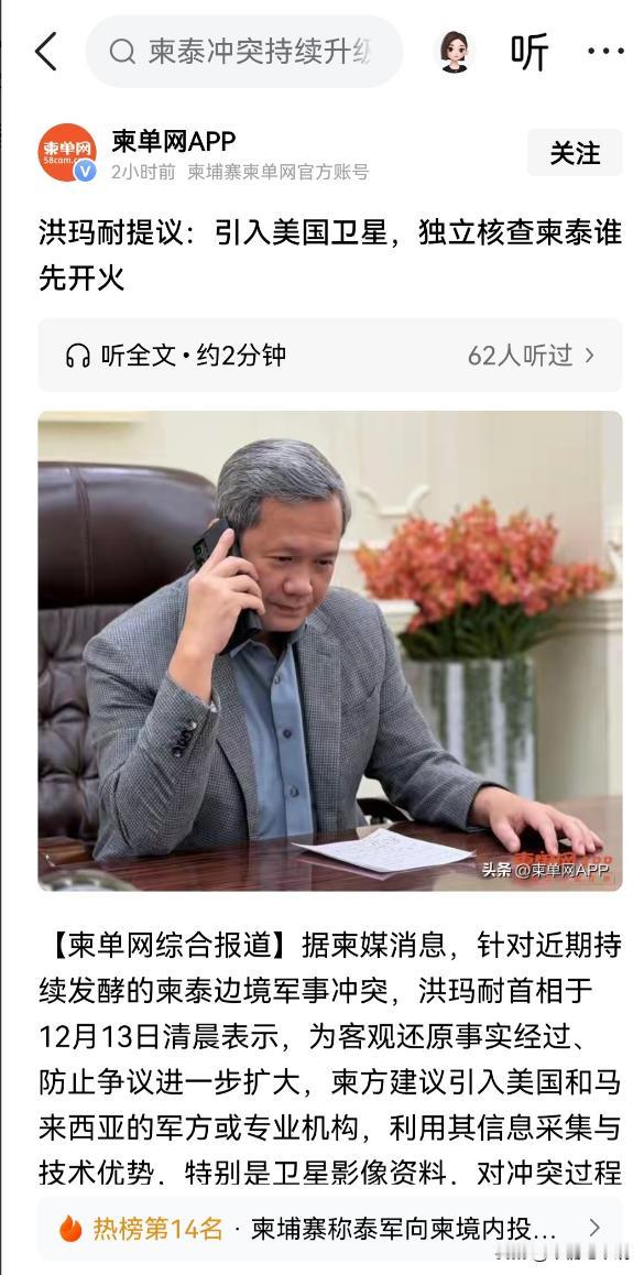 洪二亲美走到黑,智商堪忧,这样的人还想世袭领导人。居然提议引入美国卫星调查是谁先开火,谁先开火都不重要了,重要是他为什么被打?挨打的原因嘛无非三种,第一柬埔寨确实先开火,埋地雷炸了泰国士兵。第二,泰国先开火。第三,泰国发现柬埔寨自己把身后的大树砍了,泰国抓住了千载难逢的机会收复争议区域。 说白了,洪玛奈这波亲美到底的操作纯属自寻死路,别说世袭领导人的野心能不能实现,眼下先搞清楚自己为啥挨揍才是正经事。 要知道泰柬边境那片地方本就是火药桶,从1907年法国划定的边界地图留下争议,到柏威夏寺周边领土归属的百年纠葛,双方就没真正太平过,这时候不琢磨怎么稳住局面,反倒把美国拉进来搅局,简直是把一手不算差的牌打得稀烂。 最近泰柬边境冲突再起,各方目光都聚焦在局势走向,可洪玛奈抛出的提议却让人跌破眼镜,居然要引入美国卫星来调查是谁先开的火。 这提议一出来,网上的质疑声就没断过,毕竟明眼人都能看出来,现在纠结谁先动手根本没意义,核心问题是为啥偏偏是柬埔寨在这个节点被针对。 大家梳理出的三种可能性,每一种都能对应上边境争端的历史和现实逻辑,有可能是柬埔寨方面先动了手,在边境埋了地雷导致泰国士兵伤亡,这直接触发了泰国的反击。 也不排除是泰国先发起攻击,毕竟近期泰国政坛局势复杂,强硬派为了争取支持,很可能拿边境问题做文章。 还有一种更耐人寻味的可能,是泰国发现柬埔寨自己断了后路、犯了致命失误,就像把身后的大树砍了失去依托一样,于是抓住这个千载难逢的机会,顺势收复了长期争议的区域,不管是哪种情况,柬埔寨挨揍都不是偶然。 更让人看不懂的是洪玛奈这股子亲美到底的劲头,要知道他父亲洪森在政坛摸爬滚打这么多年,最擅长的就是在大国之间寻求平衡,两边骑墙的本事让柬埔寨在复杂的地区局势中站稳了脚跟。 可到了洪玛奈这里,却一门心思往美国怀里钻,这波操作也让不少网友猜测背后的隐情。 大家普遍觉得,洪玛奈当年在美国西点军校深造,后来还在纽约大学读了硕士,这段留美经历大概率不简单。 说不定是那时候被美国方面拖下了水,甚至有什么黑料被对方攥在手里,不然以洪森的政治头脑,肯定会反复叮嘱儿子不要彻底倒向某一方,毕竟现在美国在亚太地区的战略布局本就处于收缩阶段,这时候上赶着去抱大腿,纯属找错了靠山。 而且稍微了解东南亚局势的人都清楚,中国在这一地区的影响力举足轻重,不管是经济合作还是战略协作,都是很多东南亚国家离不开的依靠。 就像柬埔寨,这些年靠着中柬“钻石六边”合作架构,在工业、农业、基础设施等多个领域都获得了实实在在的好处,金港高速公路、暹粒吴哥国际机场这些项目,都是中国助力柬埔寨发展的最好证明,更不用说疫情期间中国的医疗援助、平时的人才培训支持了。 可洪玛奈现在的一系列操作,明显没把中国的利益和意见放在眼里,这种忘恩负义的举动,被网友吐槽“挨揍就是代价”也不是没道理,毕竟在东南亚的地界上,无视中国的存在、不考虑中国的利益,想顺顺利利发展根本不现实。 要知道美国的援助从来都是带条件的,之前特朗普就曾以贸易制裁相威胁,逼着泰柬达成停火,现在洪玛奈想让美国卫星介入调查,无异于引狼入室,最后很可能让柬埔寨在领土争端中更加被动。 毕竟美国向来只考虑自己的地缘政治利益,根本不会真心为柬埔寨着想,这一点从近年来美国在亚太地区的一系列操作中就能看得明明白白。 以上仅为个人看法,不代表任何官方立场,对于洪玛奈的亲美倾向、泰柬边境冲突的背后缘由,你有什么不同的见解?欢迎在评论区留言讨论。