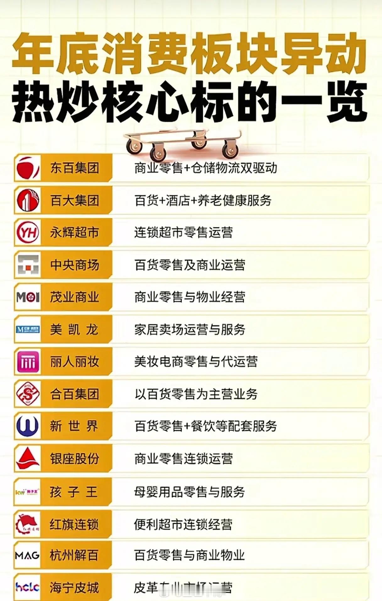 年底消费板块掀涨停潮,零售龙头凭什么成资金抢筹焦点?当东百集团、永辉超市等零售标的在年底走出连续上涨行情,2025年消费板块的异动并非单纯的资金炒作,而是消费复苏政策落地+业态升级转型+节日消费旺季三重逻辑共振的结果,零售龙头企业凭借差异化的业务布局,成为资金挖掘消费红利的核心标的。传统零售企业的转型突破成为股价上涨的核心动力,东百集团的“商业零售+仓储物流”双轮模式,依托福州、兰州等物流枢纽布局,2025年仓储物流业务营收占比提升至35%,冷链物流订单同比增长60%;百大集团跨界布局养老健康服务,旗下养老社区入住率超85%,健康服务业务成为新的利润增长点;南京新百则将生物医疗与零售融合,干细胞治疗业务与线下健康体验店形成协同,2025年三季度净利同比增长22%,业态升级让传统零售企业摆脱增长瓶颈。线下零售的场景化创新与渠道下沉同样吸引资金关注,永辉超市推进“超市+生鲜加工”模式,门店现制食品收入占比提升至20%,社区超市的数字化改造让客单价增长15%;红旗连锁的便利超市接入社区团购与即时零售,日均订单量突破500万单,2025年四季度营收同比增长18%;孩子王、爱婴室则聚焦母婴消费升级,推出育儿咨询、早教服务等增值业务,客户复购率超70%,成为母婴零售赛道的标杆。政策与节日旺季的加持进一步放大板块热度,2025年12月各地发放超200亿元消费券,重点覆盖零售、餐饮等领域,王府井、珠免集团的免税业务受益于跨境消费回流,免税商品销售额同比增长45%;元旦、春节双节临近催生的消费旺季,让美凯龙、富森美等家居零售企业迎来订单高峰,家装建材的预售订单量增长30%。值得注意的是,资金对消费板块的布局并非全面撒网,而是聚焦于有业绩支撑的转型标的,东百集团、永辉超市等企业2025年三季度净利润均实现正增长,业绩确定性成为资金追捧的关键。消费板块的年底异动,本质是消费复苏趋势与企业转型成效的集中体现。当东百集团的物流布局、百大集团的养老服务、永辉超市的业态创新形成合力,零售行业正从“传统卖货”向“场景服务”转型,而资金的抢筹也印证了市场对消费产业升级的长期看好,具备差异化竞争优势的零售龙头,终将在消费复苏的浪潮中占据核心地位。