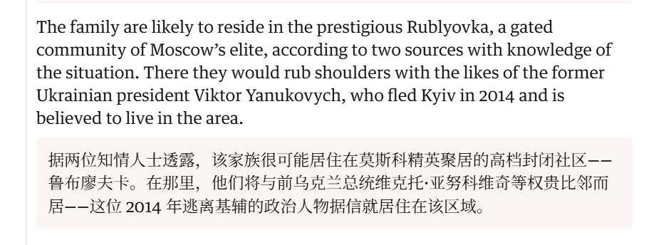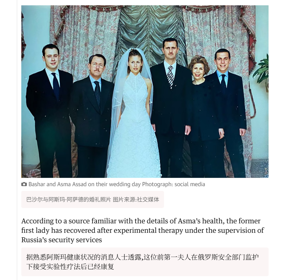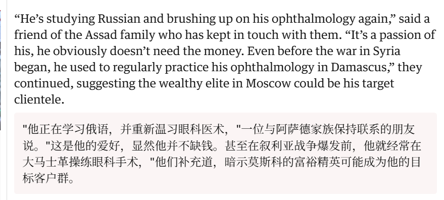 🔻《卫报》说,阿萨德正重新拾起医学老本行。据《卫报》自称的“可靠消息”透露,阿萨德如今端坐课堂,重修眼科课程。🔻“他正在学习俄语,并重新温习眼科医术,”一位与阿萨德家族保持联系的朋友说。“这是他的爱好,显然他并不缺钱。甚至在叙利亚战争爆发前,他就经常在大马士革操练眼科手术,”他们补充道,暗示莫斯科的富裕精英可能成为他的目标客户群。🔻据两位知情人士透露,该家族很可能居住在莫斯科精英聚居的高档封闭社区——鲁布廖夫卡。在那里,他们将与前乌克兰总统维克托·亚努科维奇等权贵比邻而居。🔻据熟悉阿斯玛健康状况的消息人士透露,这位前第一夫人在俄罗斯安全部门监护下接受实验性疗法后已经康复。🔻他们的子女正逐渐融入莫斯科上流社会的生活——上学、购物,并经常前往阿联酋旅行。热点现场海外新鲜事