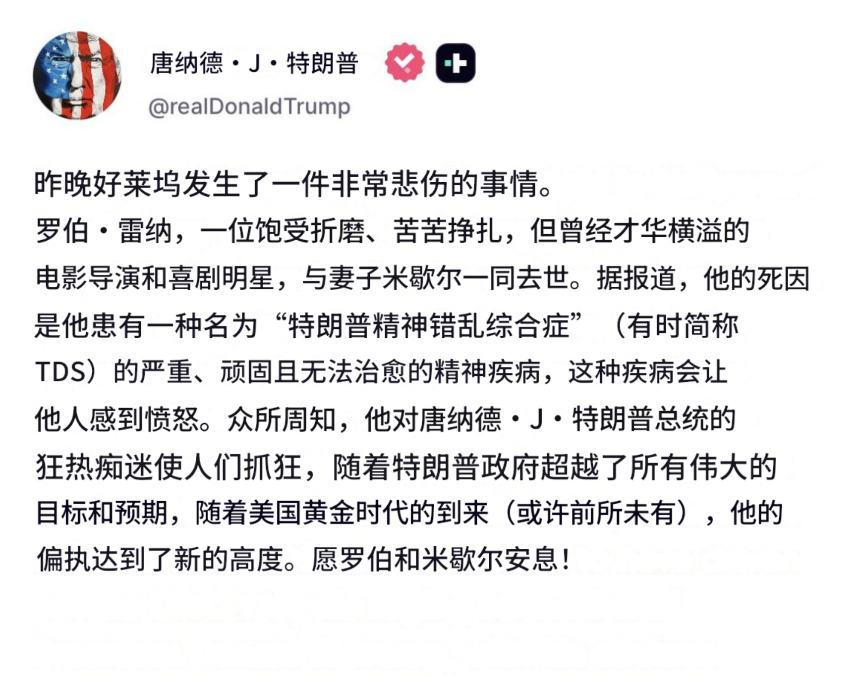 🔻最新消息——特朗普声称罗伯·莱纳夫妇已去世,“据称死因是由于他们因罹患名为'特朗普精神错乱综合征'的顽固性精神致残疾病,长期以极端、偏执且不可救药的症状激怒他人所导致。”🔻🔻有美国人表示:“这是特朗普最荒诞的一条文章之一。”🔻via disclose.tv 新闻网热点现场海外新鲜事罗伯莱纳儿子染毒瘾多年