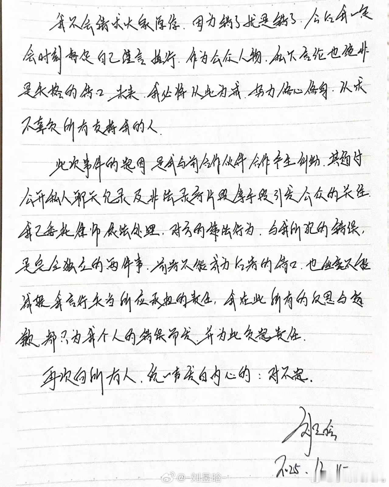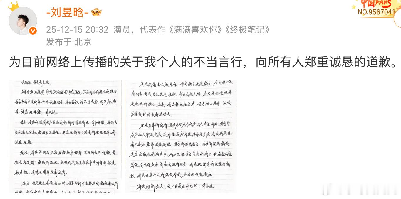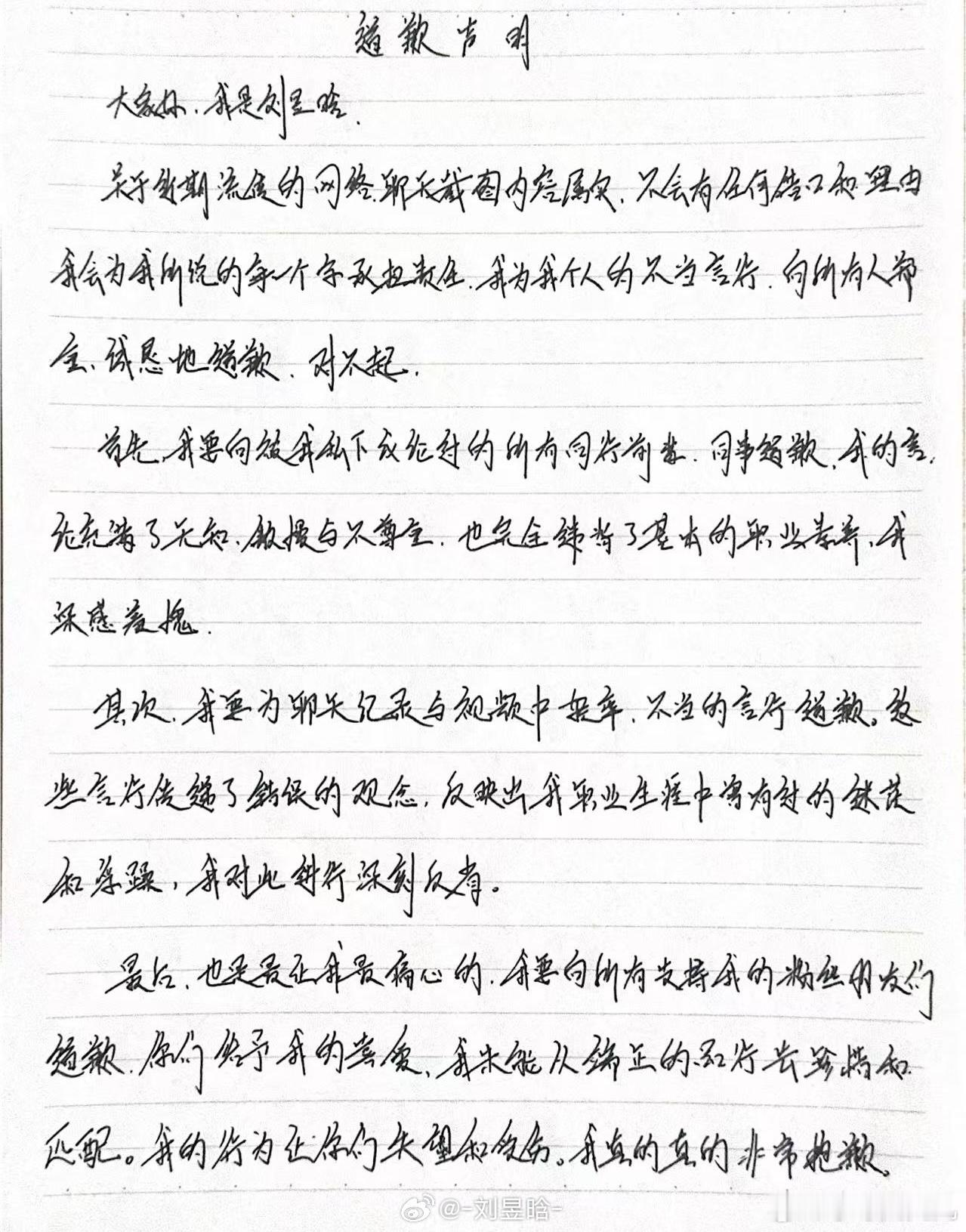 刘昱晗发手写信道歉了,承认聊天记录里自己的不当言论有一说一,这个道歉是应该的,合作演员可没对不起他啥……