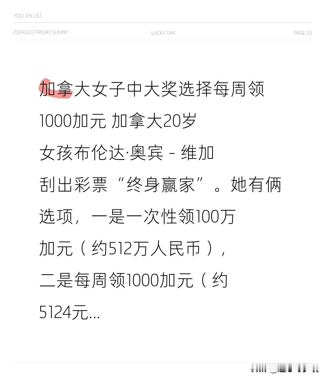加拿大女子中大奖选择每周领1000加元 加拿大20岁女孩布伦达·奥宾 - 维加刮出彩票“终身赢家”。她有俩选项,一是一次性领100万加元(约512万人民币),二是每周领1000加元(约5124元)直到终身。她选了后者,打算用这笔稳定收入买房。 网友对此看法不一。有人夸她聪明,觉得每周5000多元细水长流,能带来长久幸福感。但也有人担忧,怕遇上高通胀,钱不值钱,认为该一次性落袋为安。要是我中奖,这选择也难啊,毕竟一夜暴富和一生安稳都有吸引力。