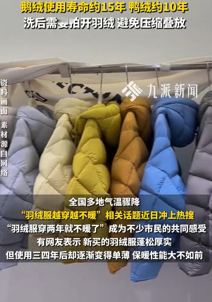 羽绒服越穿越不暖或因清洗有误,业内人士谈羽绒服越穿越不暖:洗后需要拍开羽绒,避免压缩叠放。 全国多地气温骤降,“羽绒服越穿越不暖”相关话题近日冲上热搜。“羽绒服穿两年就不暖了”成为不少市民的共同感受。有网友表示,新买的羽绒服蓬松厚实,但使用三四年后却逐渐变得单薄,保暖性能大不如前。12月15日,九派新闻采访业内人士发现,羽绒服保暖性能下降,往往并非材质老化,而是日常清洗与收纳方式存在误区。据介绍,优质羽绒具有一定使用寿命,鹅绒使用寿命约15年,鸭绒则在10年左右,前提是保养得当。在武汉经营干洗店十余年的李先生,每年冬天都要为顾客清洗上千件羽绒服。他告诉记者,很多“不保暖”的羽绒服并非填充物不足,而是内部羽绒严重结团。“家庭机洗后,大多数人只是简单晾干,却忽略了拍打这个关键步骤。 正确做法是,洗完后用衣架挂起,用手或衣架从内向外反复拍打,直到整件衣服恢复均匀蓬松。换季收纳时也应悬挂于衣柜,不建议折叠挤压。”他说,如果长期把羽绒服真空压缩存放,羽绒会因持续受压而塌陷,即使取出也难以恢复原有蓬松度。从事羽绒服、羽绒被定制二十余年的陆师傅则从结构层面解释原因。她介绍,优质羽绒的保暖原理,在于其完整球状绒朵能锁住大量静止空气,形成有效隔热层。“但频繁水洗会导致绒丝断裂,支撑力减弱”。她表示,一件品质合格的羽绒服,若保养得当,正常使用十年以上完全可行。关键在于减少清洗频次、避免干洗、杜绝真空压缩,并在每次使用后及时通风、拍打复原。 来源:九派新闻