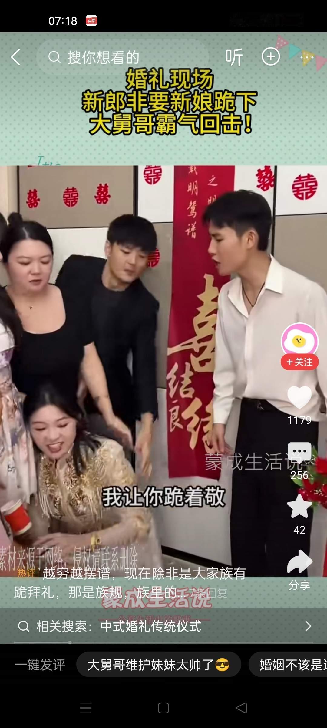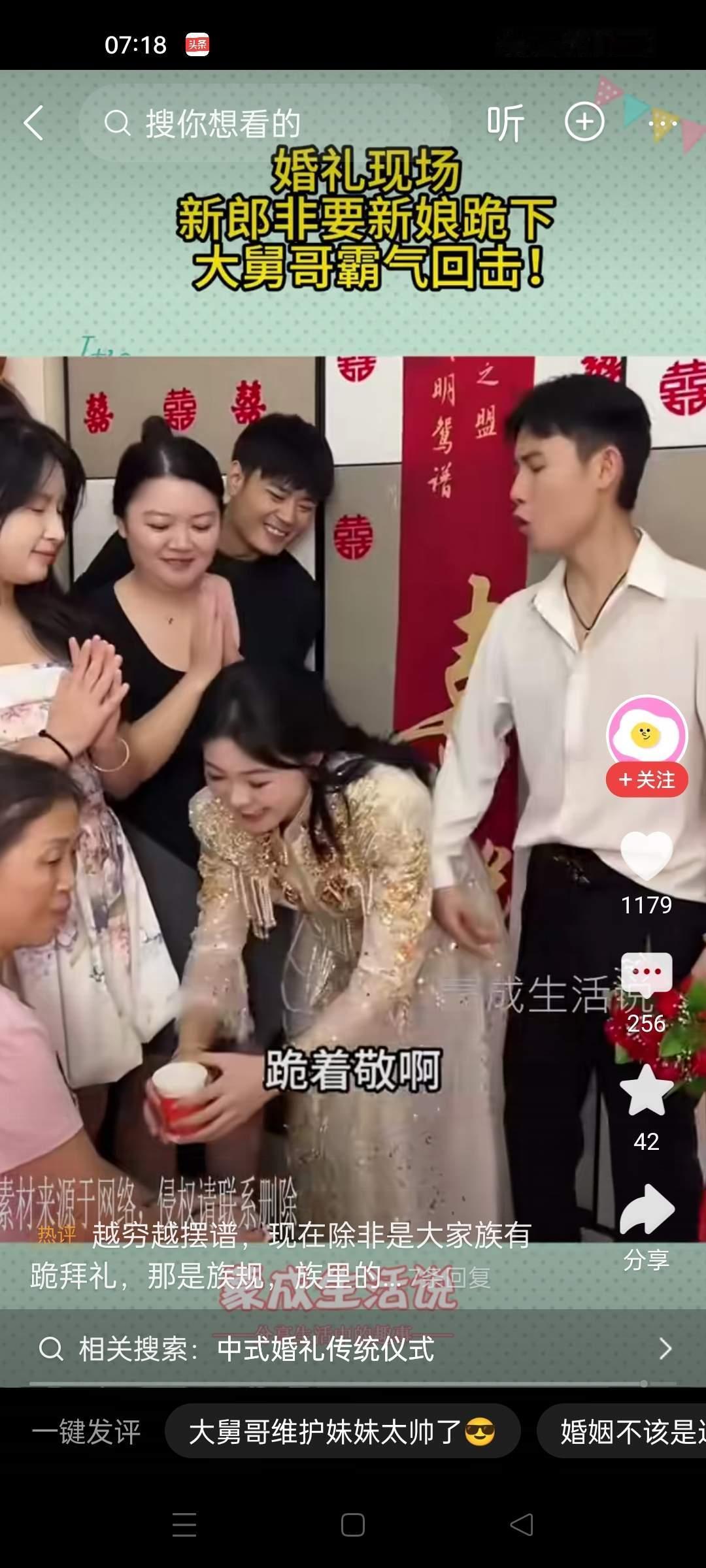 婚礼现场,新娘站着给婆婆敬茶。新郎很不爽,他推了新娘几次,说跪着敬啊。新娘没有任何反应。新郎更火了,用更大力大推,怒吼,我让你跪着敬啊。这个时候,小舅子不忍了,对着新郎大喊,我姐嫁给你不是给你当牛马的。这婚不结了。小舅子牵着姐姐的手就离开。新郎懵逼了。 这个瞬间,仿佛一场平静的婚礼突然被撕裂开来,所有人都被震惊得说不出话。婚礼原本是幸福与祝福的象征,却因为一场“敬茶”的仪式变成了家庭矛盾的爆发点。细细想来,这背后隐藏的,是多少家庭积压已久的矛盾与期待未被满足的心声。 婚礼上的那一幕,既令人心疼,也让人深思。新娘站在那儿,没有反抗,没有哭泣,只是静静地接受着这个传统的“考验”。她的沉默,或许代表着对家庭、对婚姻的尊重,也可能是对现实无奈的妥协。而新郎的怒火,暴露出的是他对传统观念的固执,还是对婚姻责任的焦虑?他们的争执,不仅仅是敬茶的礼仪,更像是一场家庭价值观的冲突。 而小舅子那句“我姐嫁给你不是给你当牛马的”,爆炸性的言辞瞬间点燃了现场的火药桶。这句话,像一记重锤,击中了所有人心中的疼痛。它暴露出家庭关系中潜藏的压抑与不满,也折射出当代年轻人对婚姻自主、个性解放的渴望。 这样的场景,是否让我们每个人都看到了自己家庭的影子?我们是否也曾在某个角落,为了所谓的“传统”或“面子”,忍受着不合理的期待?又有多少人,在面对家庭的压力时,选择了沉默或妥协?而那些敢于站出来表达自己的人,是否就被视作“叛逆”或“不懂事”? 其实,这场风波背后隐藏的是深层次的家庭情感和价值观的碰撞。我们需要反思:婚姻不仅仅是两个人的事情,更是一场家庭的融合与妥协。尊重与理解,才是家庭和谐的基石。而所谓的“传统礼仪”,如果变成了束缚和压力,那就值得我们重新审视。 让我们用这场“婚礼风波”提醒自己:无论传统如何重要,尊重与沟通才是家庭幸福的真正密码。每个人都值得被理解、被尊重,不应让仪式成为桎梏。家庭的温暖,从理解开始,从包容开始。 这场风波,是家庭的裂痕,也是一个反思的契机。我们期待更多的家庭,能在尊重和爱中携手前行,把握住婚姻的真谛,而不是被传统的阴影所困扰。毕竟,幸福的婚姻,是彼此的理解和支持,而不是盲目的遵从和压抑。