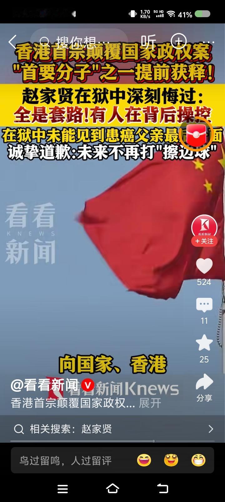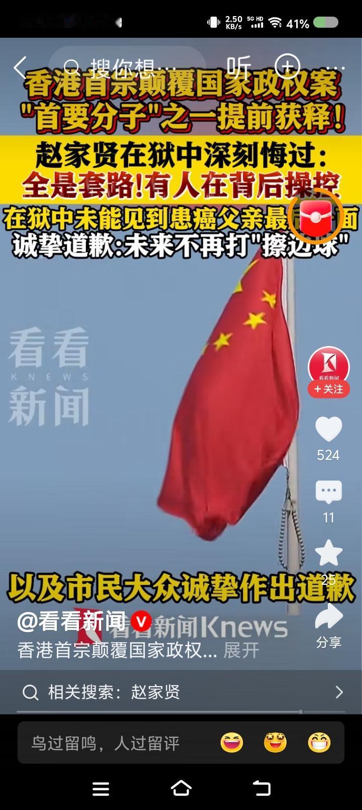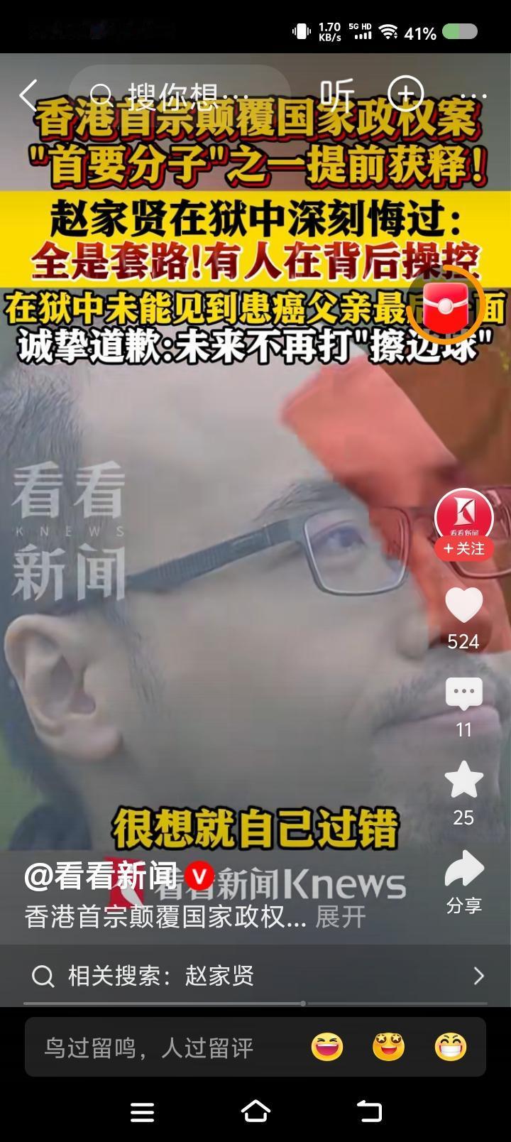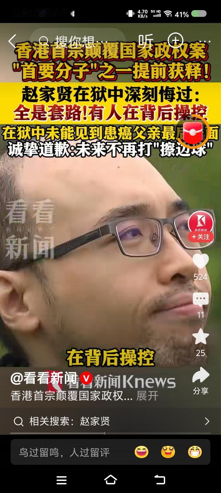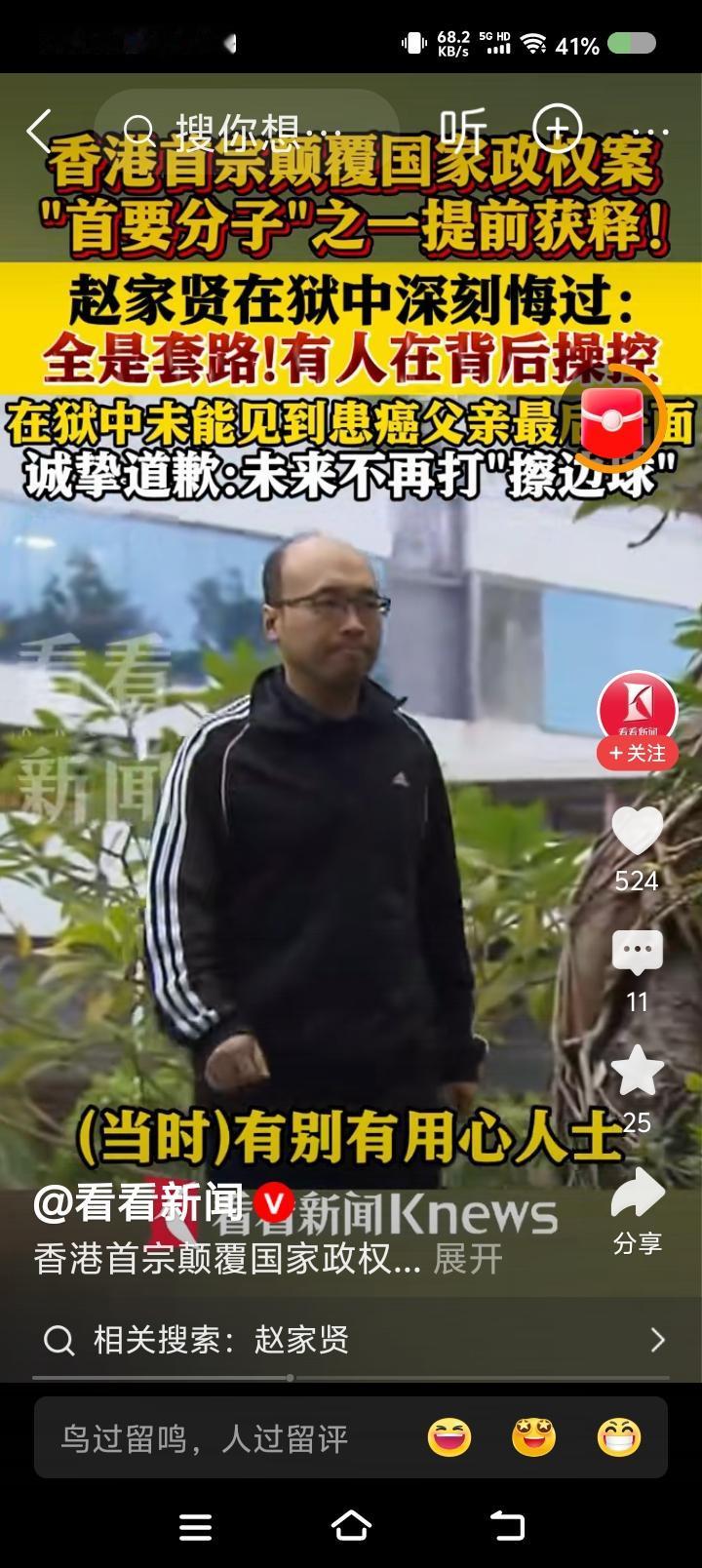 为什么反zhong乱港分子提前出狱了?—— 据报道,反zhong乱港赵某提前获释。资料显示,赵某因串谋颠覆国家政权罪案,2024年11月被判7年。 点评: 一、记者,你少标点了!造成很大误解。 二、为什么能提前获释? 三、他会改过吗?