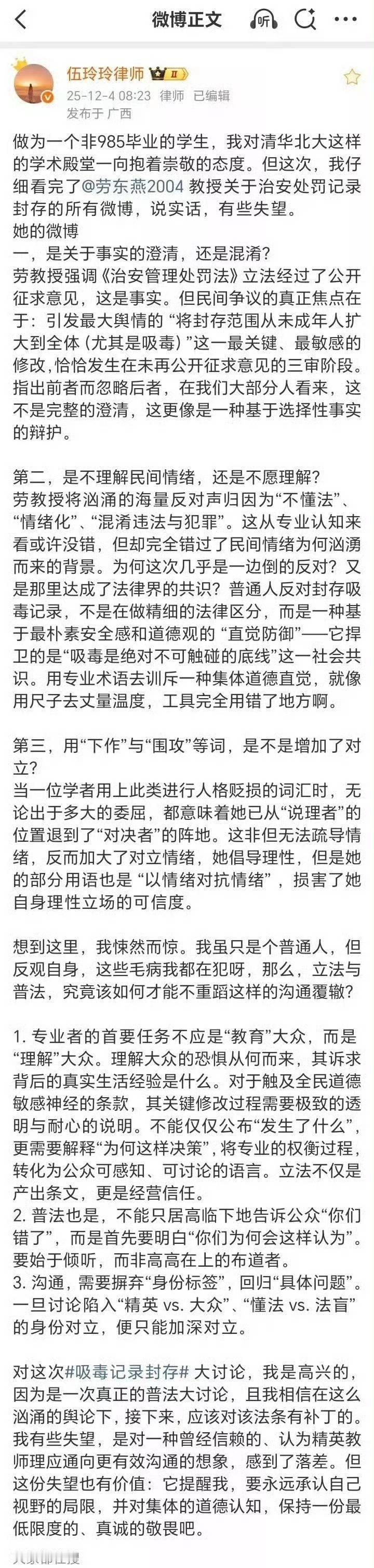 记录者 这位律师,说的就很客观,很有修养,很显然不是那个所谓的“法律界的共识”群体了,动辄拿大帽子扣人的人,一定是需要防范的、远离的人!如果中国的司法系统充斥着这样一群心胸狭隘、水平低劣、以霉西方作为“精神母国”的“法律界的共识”群体的话,那一定是非常危险的,因为他们的最终目的,是为了“架空”党和国家的最高领导权,一切让位于他们这个群体自己,通过他们自己在立法动议、推进立法、执行、司法解释等等一系列操作,掌控一切!他们这个群体已经走在卖国求荣的路上,我们能眼睁睁地看着他们这个群体将我们及子孙后代的福祉命运带向不归路吗?