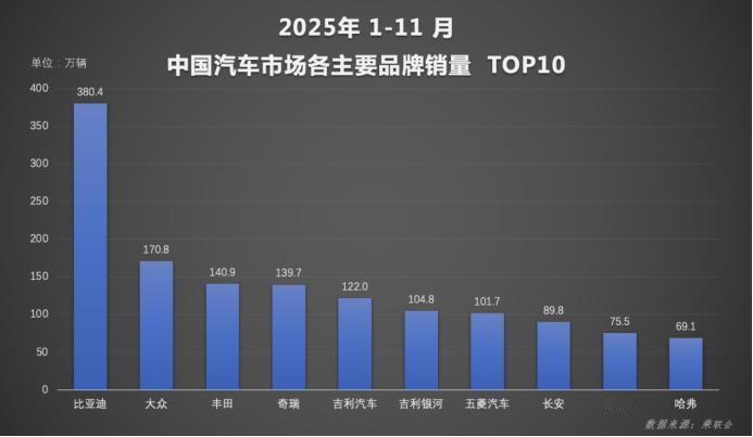 今年的车市基本上宣告大结局了!从前十一个月的销量来看,排名靠前的比亚迪、上汽、吉利等车企目标达成率都超过了90%,完成年度销量目标几乎是板上钉钉,这意味着在不需要为了年度目标冲刺的情况下,几家车企最终的年度排名大概率不会有太大变化了。 这其中,比亚迪表现亮眼持续领跑,前11个月累计销量418.2万辆,领先第二名的上汽集团7.4万辆。值得一提的是,11月份比亚迪销量超48万辆,创下年内新高,旗下的秦家族、方程豹钛7、海狮06等车型都有着亮眼的表现,尤其是上市不久的方程豹钛7,单月卖出了2.4万辆,助力方程豹品牌单月销量达到了37405辆,同比增长339%,月销量超过了“蔚小理”。 另外,在海外市场,比亚迪月销量来到了131661辆,同比增长297%,今年累计出口量超过91万辆,2025年全年出口有望超百万辆。 有意思的是,就是这样一份谁看了都能笑醒的成绩单,比亚迪似乎并不满意,就在不久前,王传福还进行了公开反思。可以肯定的是,明年的比亚迪会有一系列“炸裂”新技术上车,许多高端技术也会被下放到10多万车型上,再加上纯电续航里程和充电速度的提升,整体的竞争力相比今年会有明显的不同。 咱就说,还没发力的比亚迪尚已如此,明年的比亚迪又会是什么样呢?【来自懂车帝车友圈】