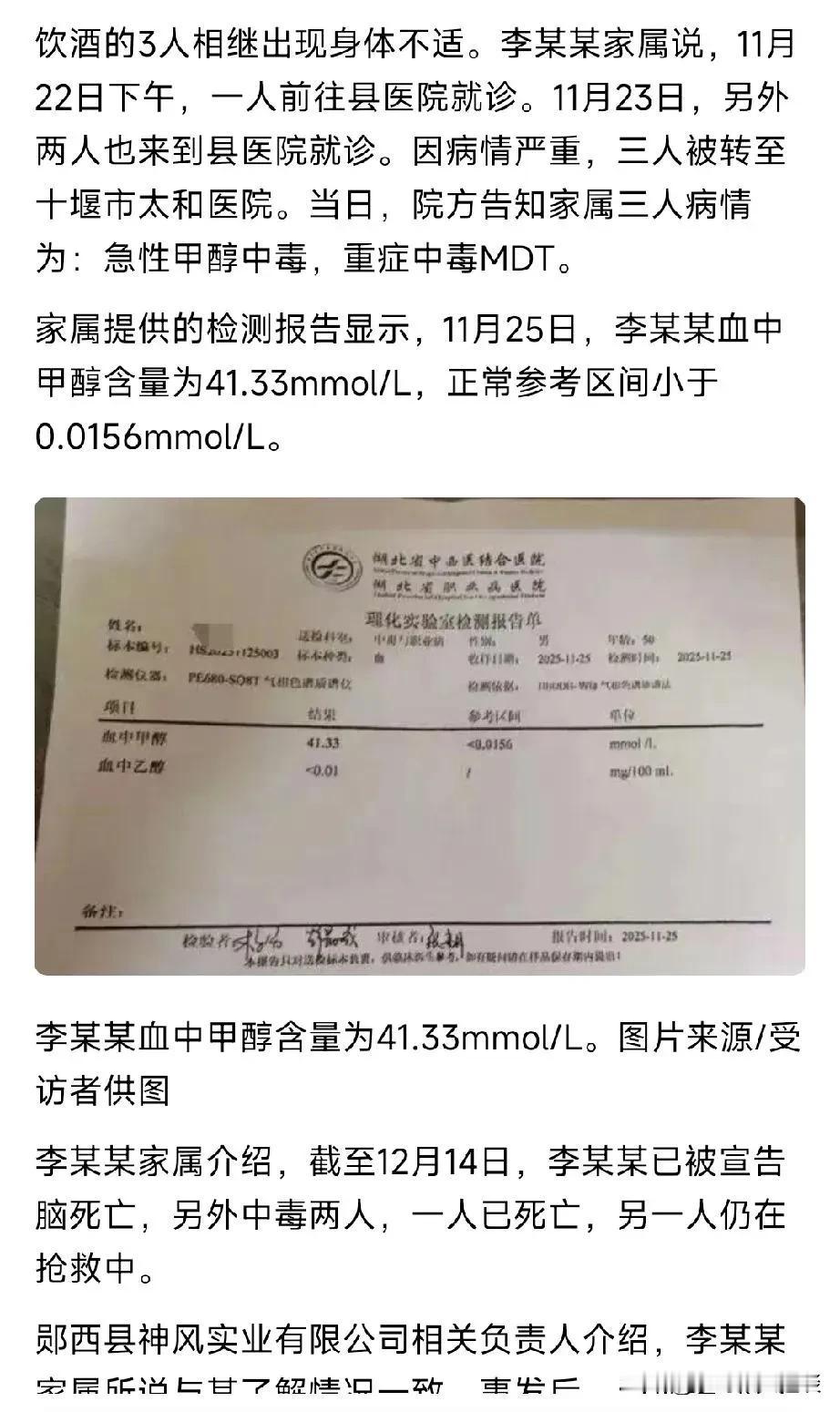 悲剧发生。公司3人误把食堂用来作燃料的工业酒精当白酒外带食用!公司员工三人一起约好外面饺子馆聚餐,他们把食堂的做染料的工业酒精当白酒喝了,总共三人喝了才一斤多,但是三人过后出现严重不适,就医检测发现是急性甲醇中毒,一人死亡,一人脑死亡,一人还在抢救。 爱喝酒的人以后要注意,想喝酒就喝好酒,最低也是正规厂家超市购买的酒。 看清楚酒瓶里是什么。一时疏忽导致致命的事发生。这还不是假酒,是厨房用的工业酒精染料,没看清误拿,太可惜了。