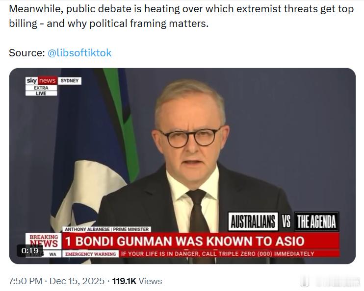 澳大利亚继续在作死的道路上狂奔!澳总理在邦迪袭击后将关注点转向“右翼极端主义”在致命的邦迪海滩光明节袭击事件发生后——袭击者是一对父子,并宣誓效忠于ISIS——但总理安东尼·阿尔巴尼斯警告澳大利亚民众注意“右翼极端主义”。是的,你没看错。袭击者受伊斯兰主义启发,但政府的即时公开表述却包括对极右威胁的警告——这是一个过于熟悉的模式,模糊了责任归属和反恐信息传递。此次袭击造成16名无辜者死亡,数十人受伤,整个国家陷入震惊。情报显示,袭击者是与ISIS有关的孤狼行动者,当局正在调查数字网络、激进化途径及潜在同谋。