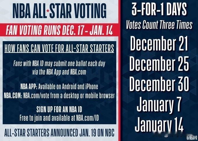 全明星投票开始啦!!!NBA全明星投票活动始于12月18,止于1月15日! 北