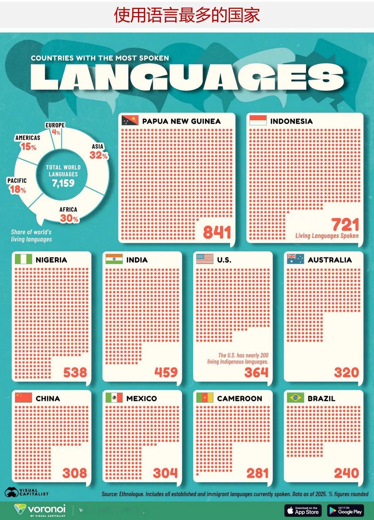哪些国家使用的语言最多? 世界各地的语言多样性各不相同,这种多样性是由地理因素、人口迁移以及数百年来的文化发展所塑造而成的。有些国家拥有数百种不同的语言,这些语言通常集中在具有深厚历史渊源的小型社区中。 下图表展示了 2025 年拥有最多语言种类的国家。该图表的数据来源于《语言学索引》。 ——巴布亚新几内亚使用的语言数量引领世界 巴布亚新几内亚使用的语言数量在所有国家中遥遥领先,截至 2025 年已记录有 841 种活语言。其崎岖的地形和孤立的社区使得各种独特的语言得以在数千年间蓬勃发展。这种语言的多样性超过了整个全球地区的水平,甚至超过了整个欧洲的水平。这种语言的多样性程度超过了全球各地的水平,甚至超过了包括整个欧洲地区。 该国依然是世界上语言遗产最为集中的地区。 ——印度尼西亚和尼日利亚紧随其后,成为多语言大国 印度尼西亚以 721 种语言位居第二,这些语言分布在其辽阔的岛屿网络之中。地理上的隔离以及长期存在的当地文化有助于在整个群岛范围内保持语言的多样性。 尼日利亚紧随其后,拥有 538 种语言,这反映了其长期以来的地域特色。 ——规模庞大且文化多元的国家排名也很高 印度、美国和澳大利亚各自拥有数百种仍在使用的语言。 在印度,语言的多样性与深厚的历史传统以及各地区的独特身份紧密相连。 尽管英语在美国是占主导地位的语言,而西班牙语也是第二普及的语言,但这个国家仍有 364 种活语言存在,其中包括近 200 种本土语言。 澳大利亚的语言格局是由其原住民语言以及多元文化的移民模式所塑造的。