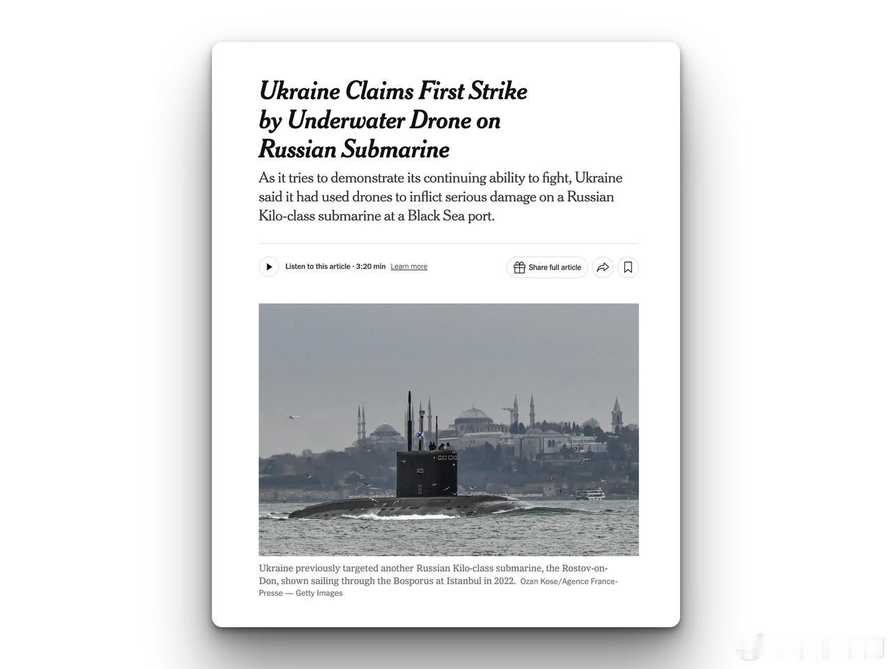 乌克兰首次使用水下无人艇袭击了俄罗斯潜艇。 乌克兰国内情报机构称,乌克兰水下无人艇周一首次击中一艘俄罗斯潜艇,对该潜艇造成严重损坏,这也是乌克兰首次公开承认使用新型武器。 据该机构称,袭击发生时,这艘基洛级潜艇停泊在俄罗斯黑海新罗西斯克市附近的一个港口,船上载有四套“口径”巡航导弹发射装置,莫斯科经常使用这种导弹袭击乌克兰境内目标。