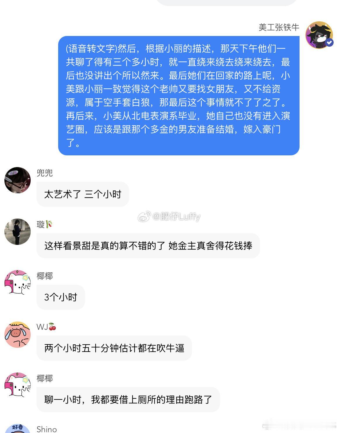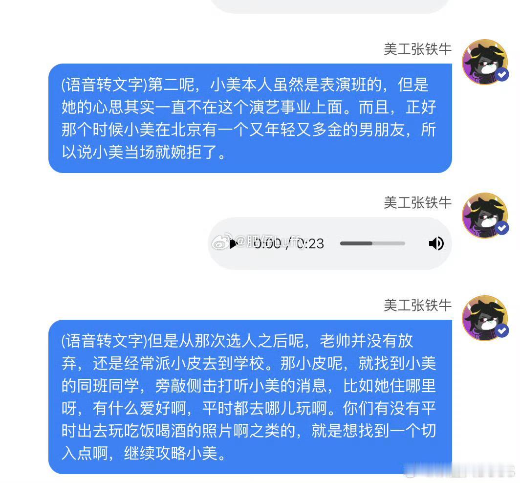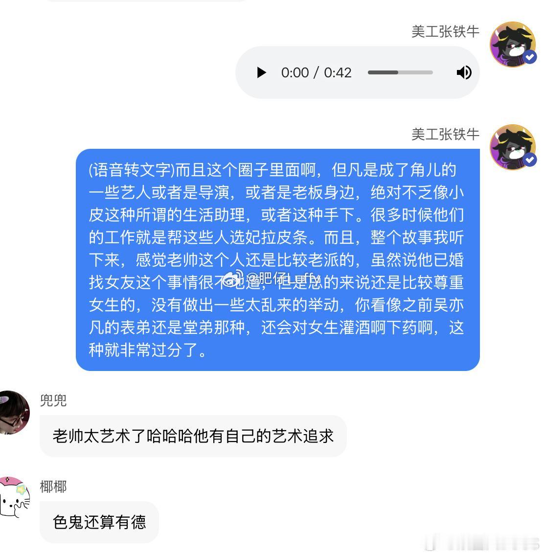 谁懂啊家人们!博主张铁牛这瓜直接炸穿娱乐圈!六七十岁的第五代大导演“老帅”,坐拥北京顺义独栋厂房私密公司,不好好拍戏,疫情前天天扎北电蹲新人,一眼就瞄上了小美。 直接派手下“小皮”冲上去传话:“我老板想让你当女友”,那架势活脱脱就是个专业拉皮条的!关键小美可是吴磊、宋祖儿同班同学,本来就对演戏没兴趣,身边还有年轻多金的男友,当场婉拒,半点面子没给老导演留。 被拒后老帅还不死心,让小皮天天往学校跑,扒小美各种信息,又邀她去公司参观。小美拉着同学小丽作陪,结果一去才发现全是画大饼,纯纯空手套白狼,连点实际诚意都没有。最后小美直接弃圈跑路,毕业后嫁入豪门当阔太,老帅竹篮打水一场空,六旬老头想老牛吃嫩草,终究是自讨没趣,尴尬到脚趾抠地!