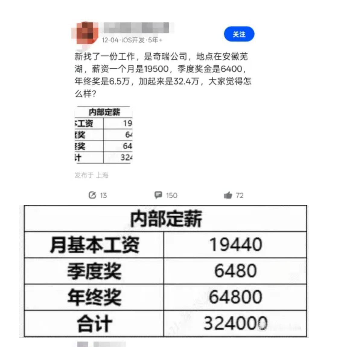奇瑞一位iOS开发爆料:月薪19500,季度奖6400,年终奖6.5万,合计32.4万,坐标安徽芜湖。 读书还是有用的,看什么学校,什么专业。