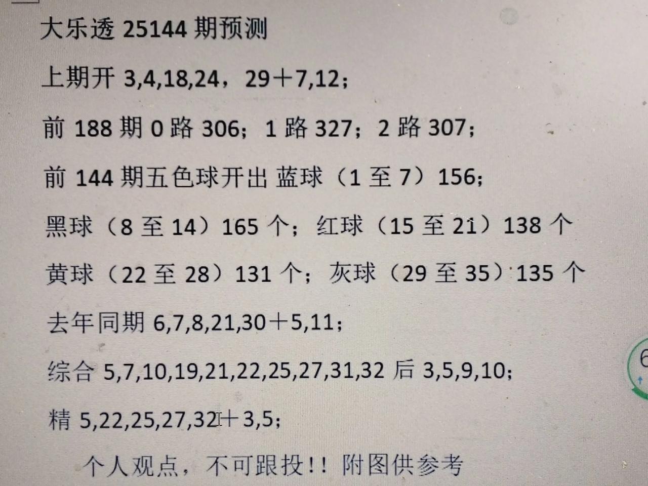 上期前区开出4尾4期,9尾3期,29重号3期。无黑球号。本期估计9尾19。无4尾。 后区上期开奇偶,全红波号全大数。本期估计3,5,9,10有号开出。