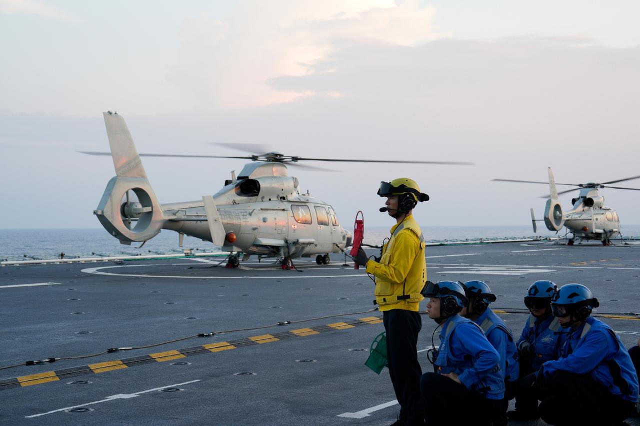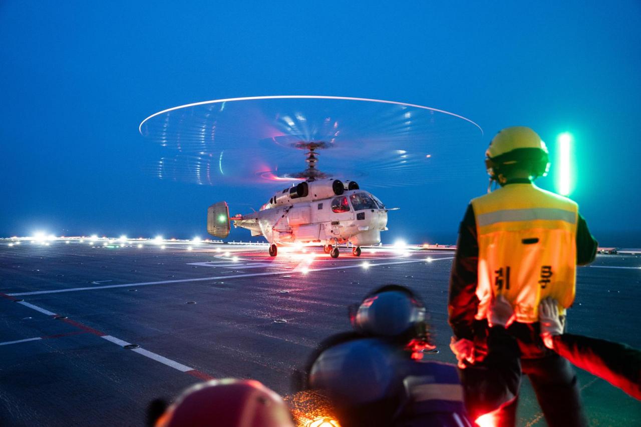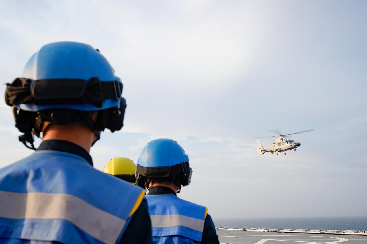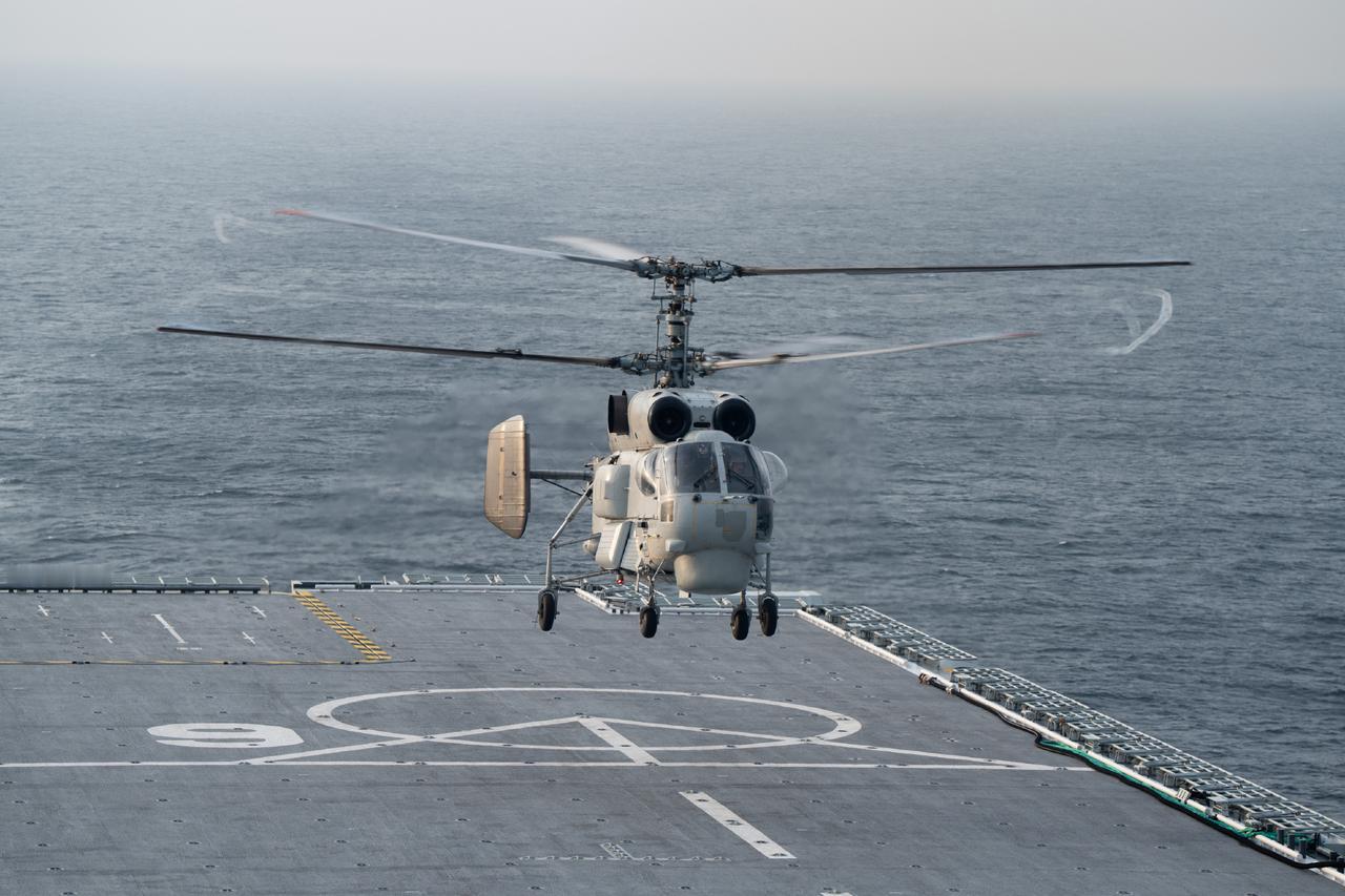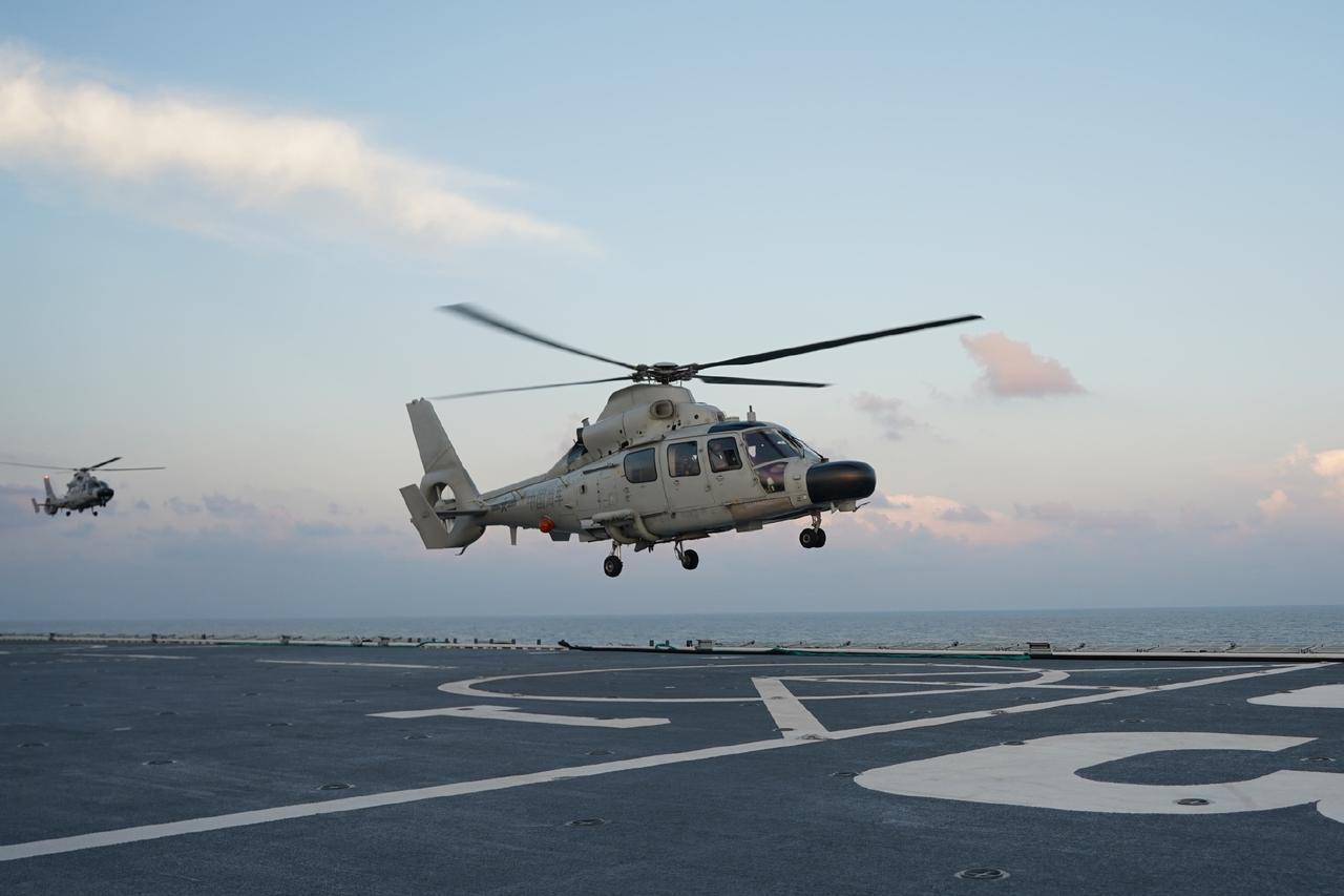 075两栖攻击舰上,正在进行舰载直升机起降训练,参加训练的主要是直-9舰载型和卡-28反潜直升机。这两个都是海军航空兵的老装备,未来主要会被直-20的各种各型代替。注意直九机腹的鱼叉着舰辅助系统,在驱逐舰和护卫舰上着舰时,需要鱼叉伸到甲板上的孔网中,将直升机拉住固定在甲板上,而在两攻上起降时,宽阔的甲板就需要鱼叉系统了。