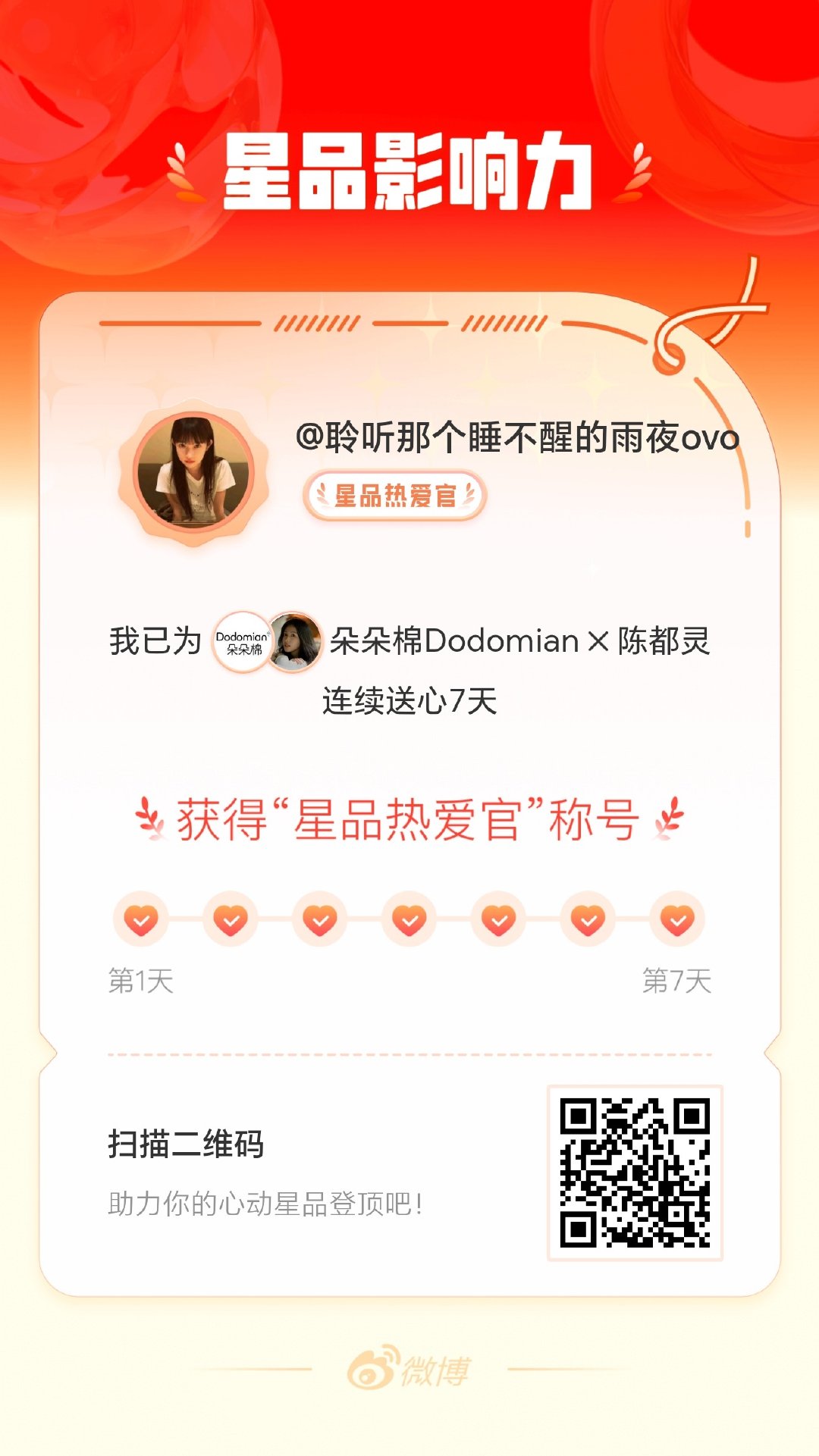 我在星品影响力上为X连续送心7天,获得“星品热爱官”称号!快来一起pick你