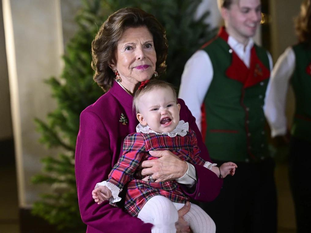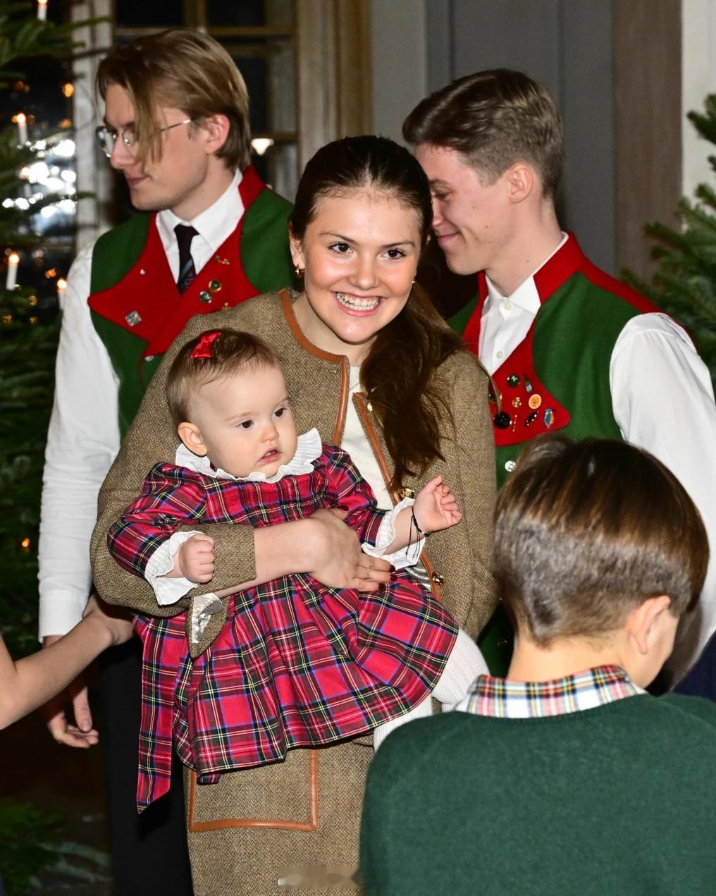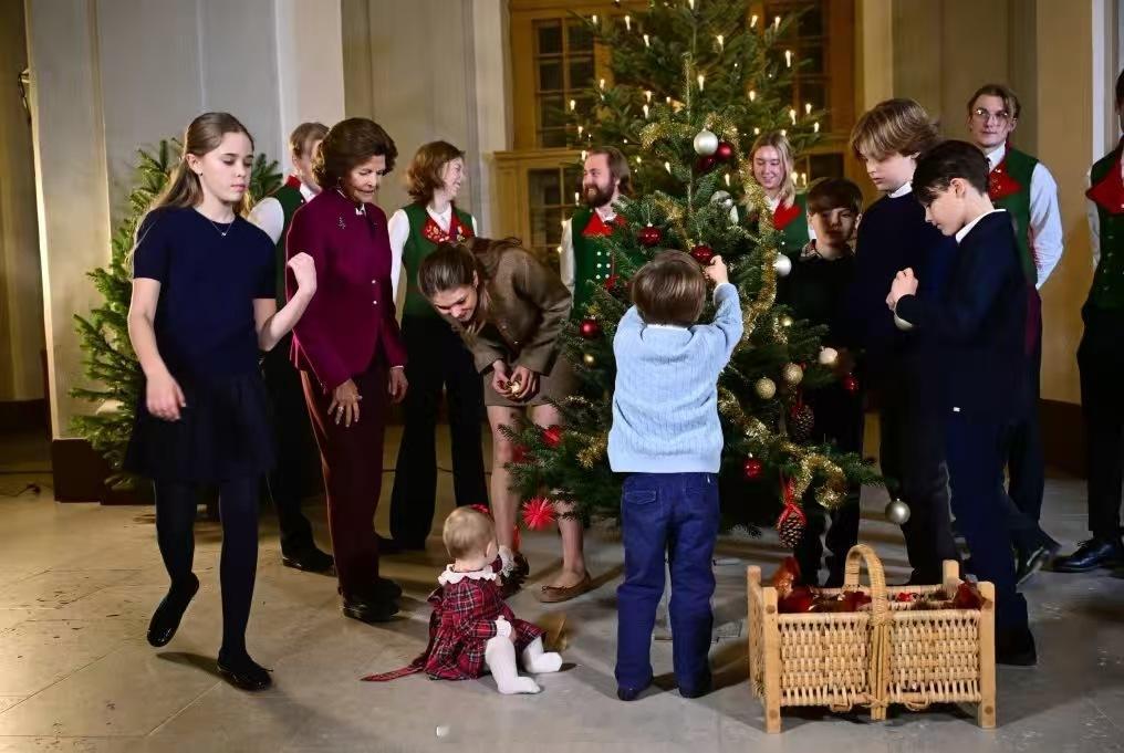 12.15 瑞典王后西尔维娅和9个孙辈接收今年王宫的圣诞树,近几年形成习惯就祖孙组合了艾斯特套裙来自malina,也太老气了
