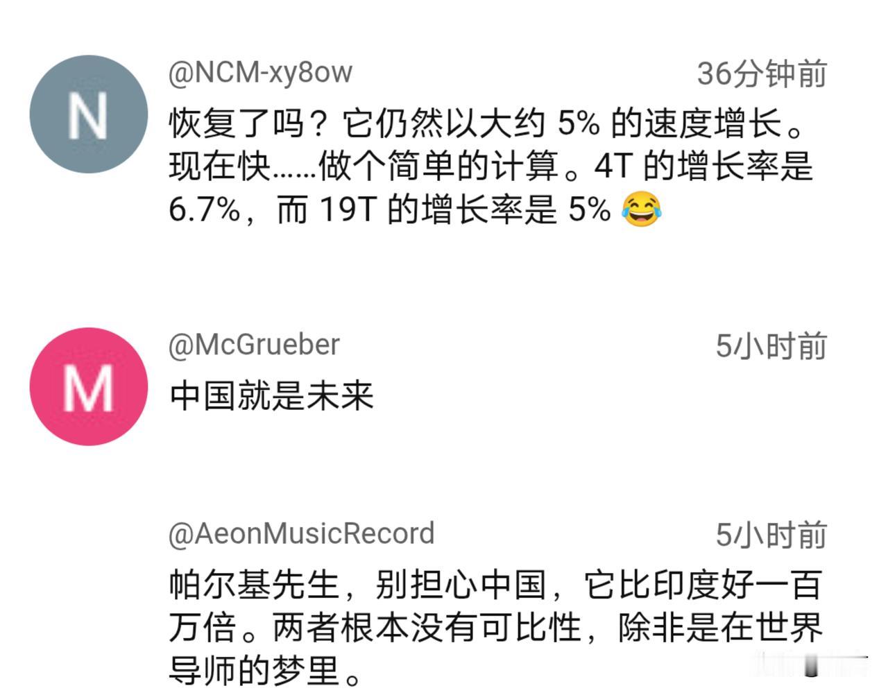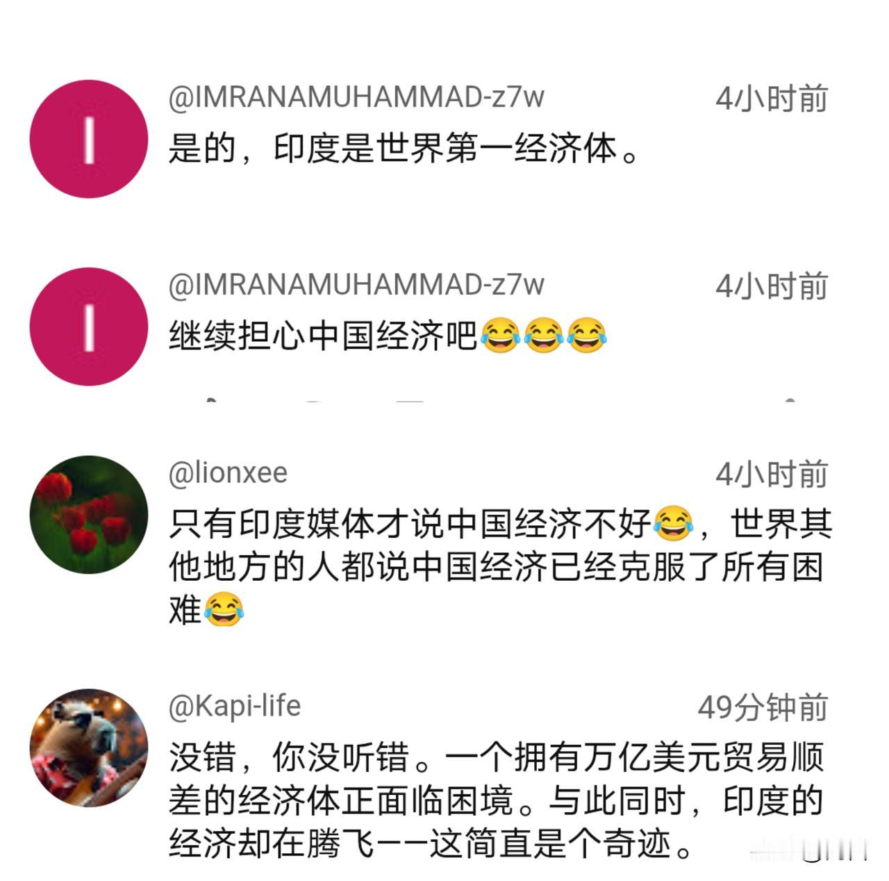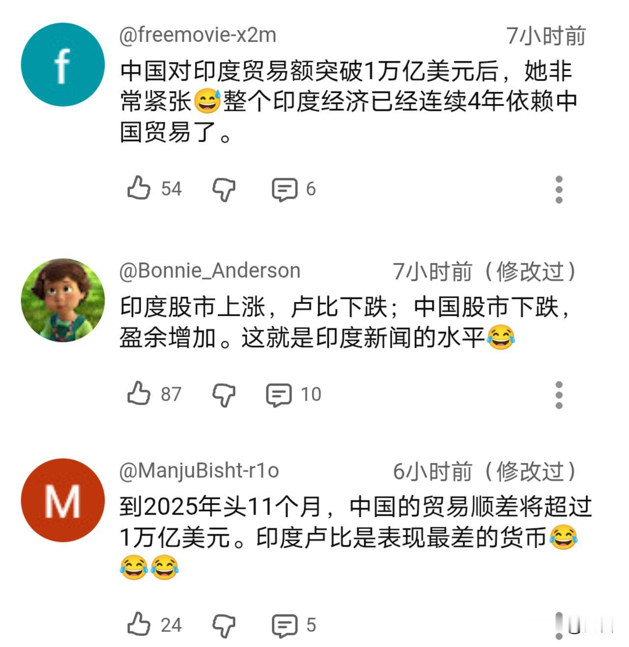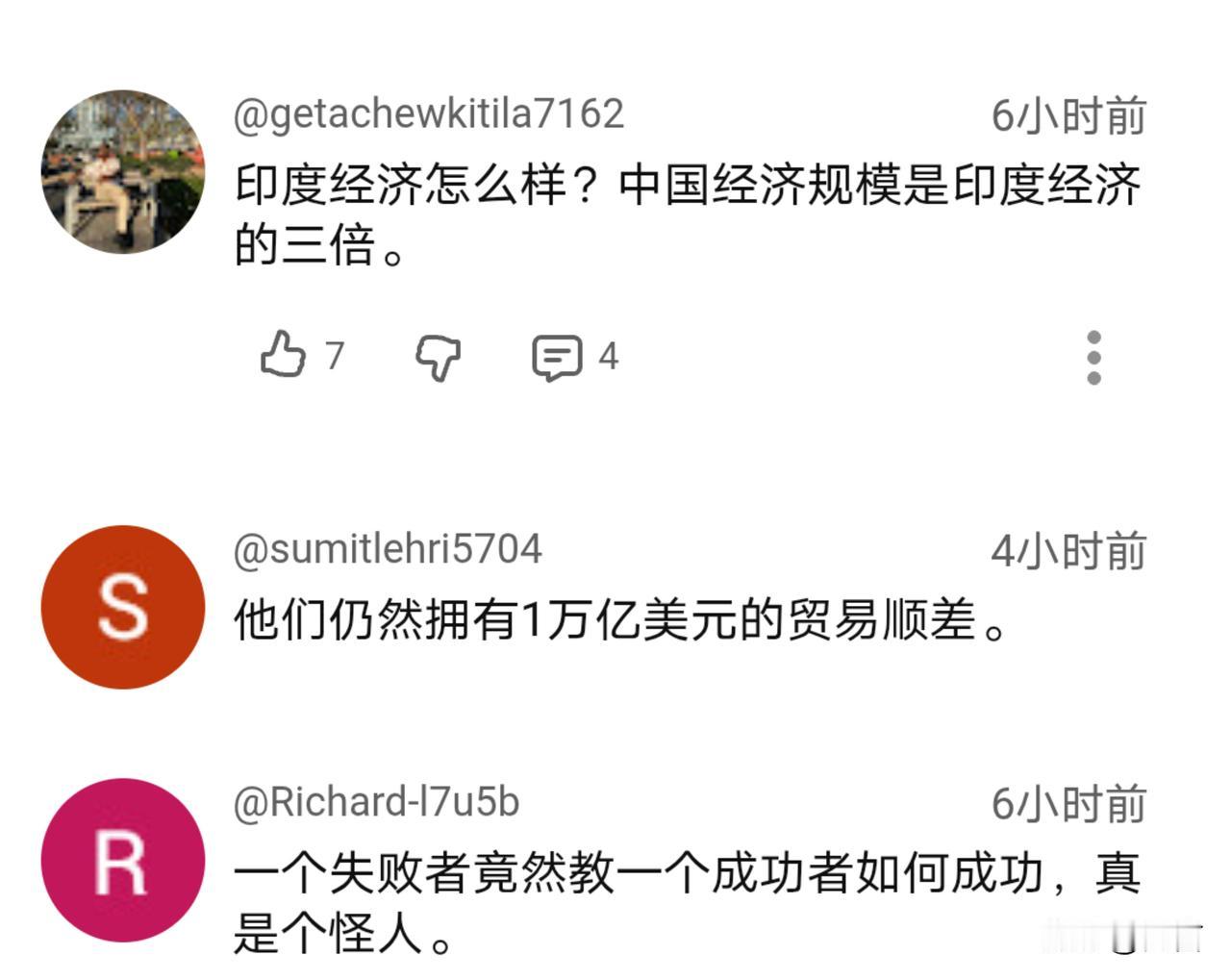 酸了!老外:中国不用你们操心。 看见中国贸易顺差达到了10000亿美元后印度媒体又酸溜溜的,在12月15日的报道中称,除了贸易顺差是一大亮点外,而其他方面则未达预期、经济复苏乏力等。 对于印媒的报道,老外们自然没有当真,并以幽默风趣的言语进行了回应。对于两国的表现国外网友可谓是心知肚明,除了名义增长率印度略为领先外,含金量和质量等则远不如我们…