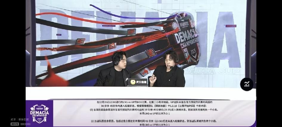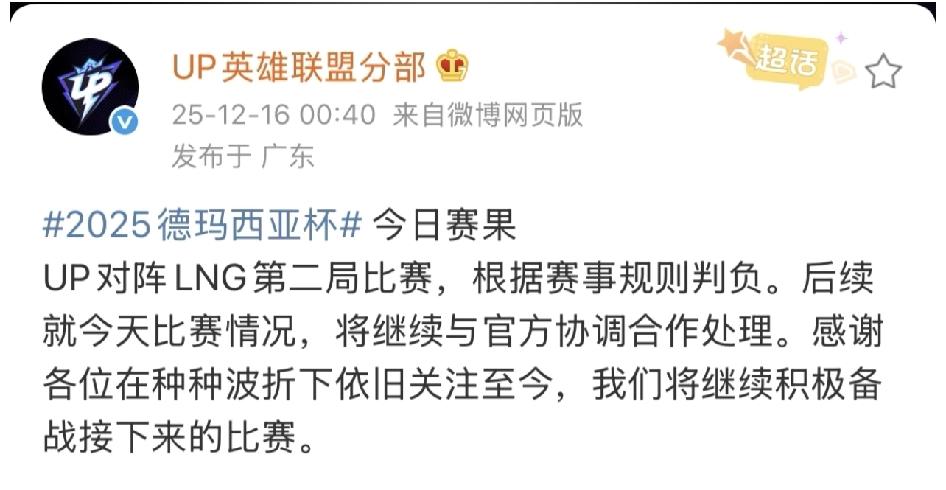 今年德杯真的就是在胡闹。 大开眼界了。德杯首个比赛日最后一场,UP第一局虐了LNG,后续因为网络、客户端等各种观众未知的原因迟迟无法进入比赛,官方直接连续两局判负,最后赛果是LNG 2比1 UP,一把没赢反而是获胜方。 关键是上一个公告还在说“比赛服技术原因”,下一个公告就直接拿了一个一百年只用一次的条例来判负了,这有逻辑吗这?延迟到明天打难道不行?换俩流量战队来敢这么判吗? UP方则表示将会继续协调合作处理本次赛果。 顶级团队。