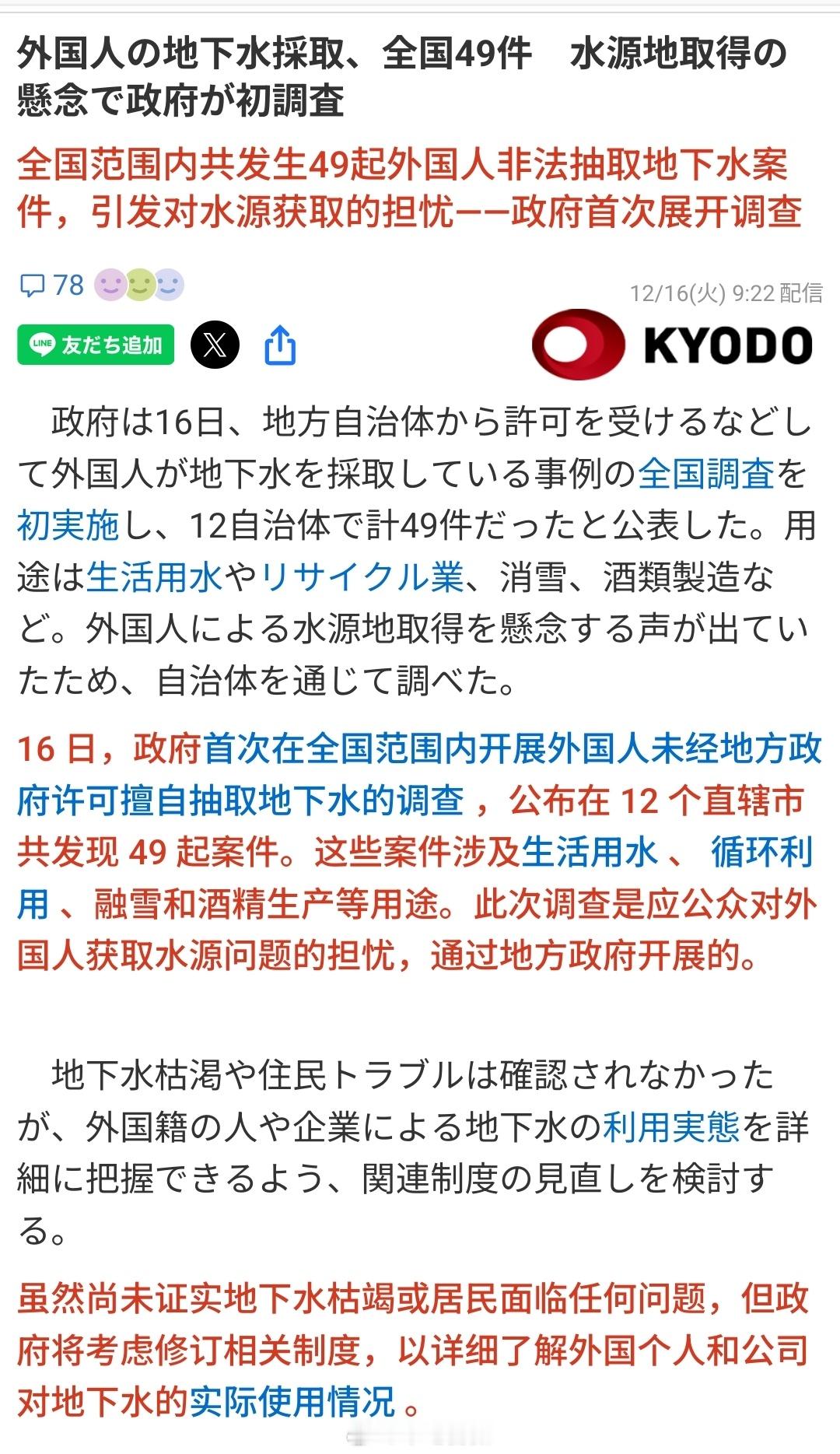 外国人怎么这么坏啊,跑到日本去就为了偷地下水了是吧——日本调查各地外国人取水。⭐这水是金子做的还是银子做的,幽默老日总能找到新角度甩锅外国人。日本不需要把国家带向战争的首相