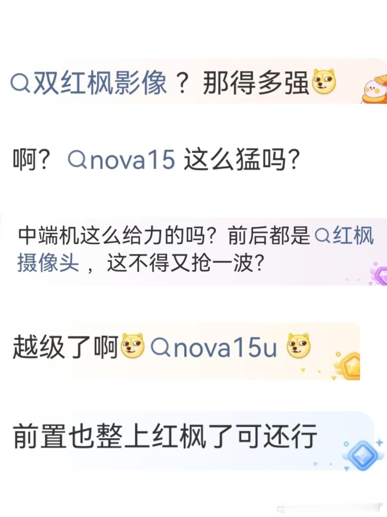 华为nova15或将搭载前后置双红枫华为nova15系列定档发布,Pro/Ultra版首搭前后双红枫原色镜头,全系配麒麟芯+12GB起步存储,还有百瓦快充与卫星通信,价格实惠,堪称中端旗舰全能王! 华为nova15有望迎来全系大升级