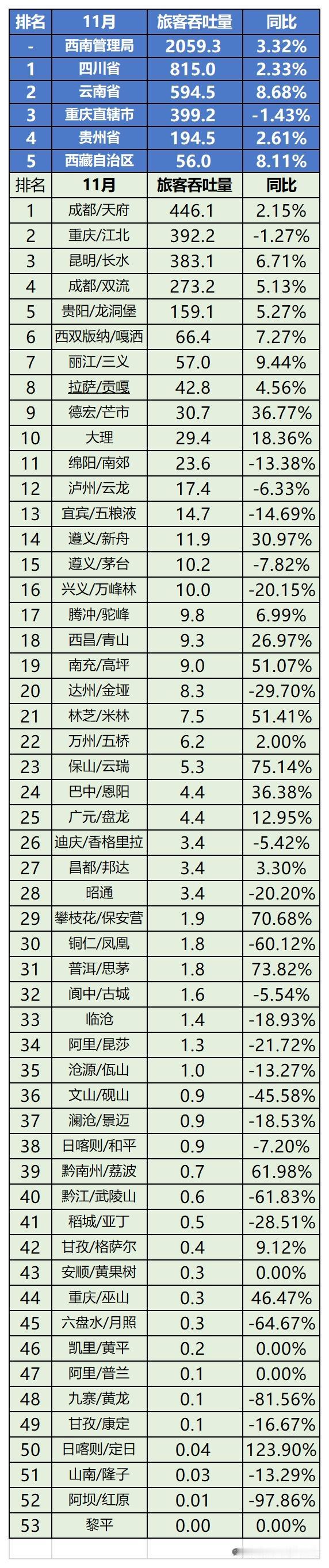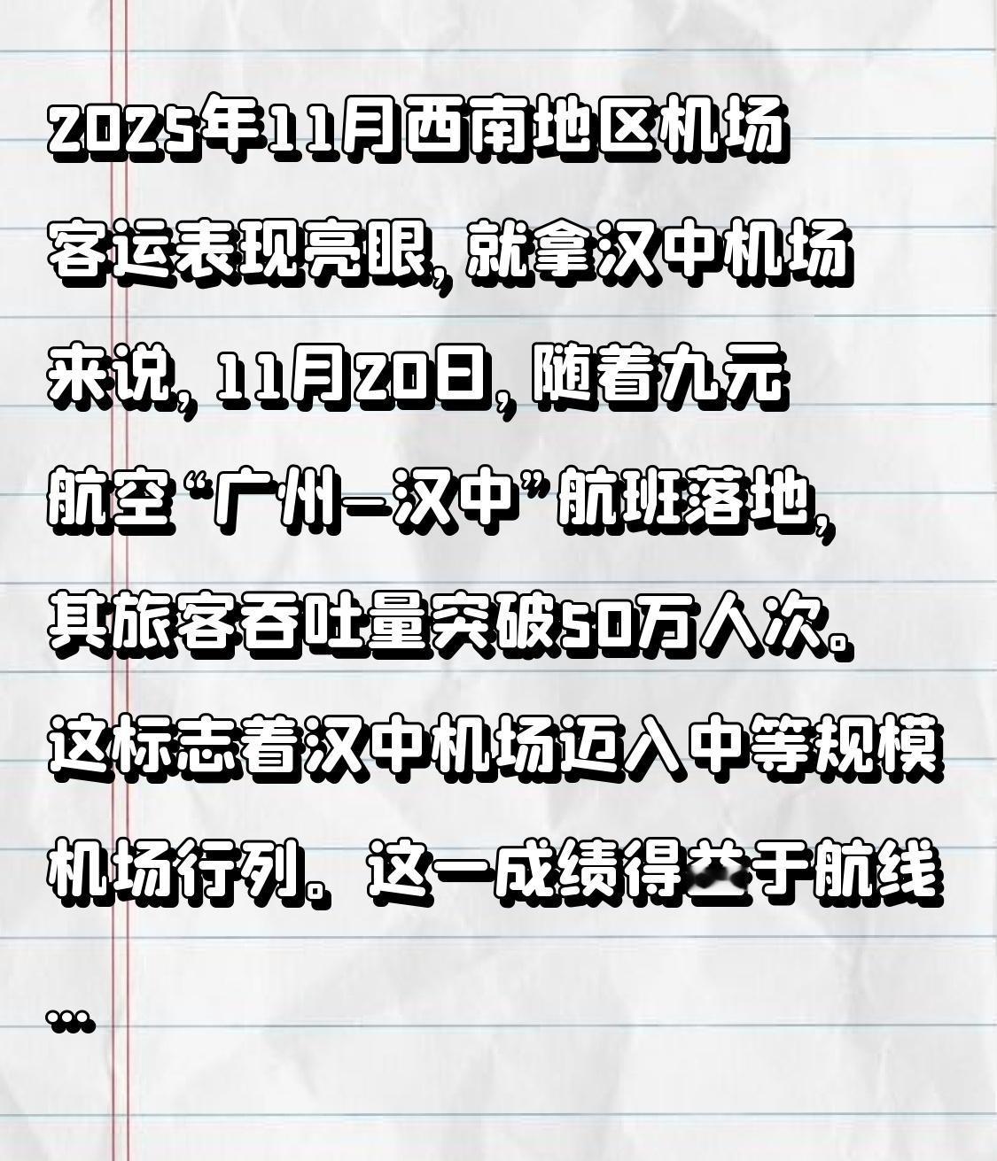 2025年11月,西南地区52家机场的旅客吞吐量数据很值得关注。就拿汉中机场来说,11月20日,随着九元航空“广州—汉中”航班落地,其2025年旅客吞吐量突破50万人次。这意味着汉中机场迈入中等规模机场行列。 这一成绩得益于航线和服务的双重提升。2025年汉中机场航线布局优化,周航班架次同比增25%,有13条航线通达16座城市。同时,机场服务更便民,航班截载时间缩至20分钟,还为特殊客群定制服务。这些举措让汉中机场客运量稳步攀升,也为西南地区航空发展添彩。 机场排名 机场数量 机场排行 机场客流吞吐量 机场数量排行榜 机场客运量 西南
