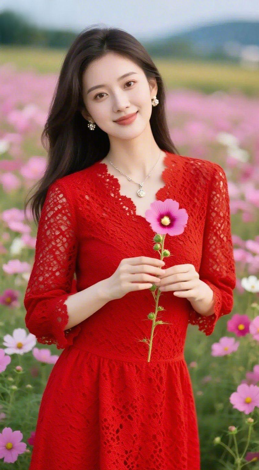 《红裙浸在花潮柔》 粉紫花浪漫过田埂时,她静立在夏风的轻裹里。 红裙织着蕾丝的软,似将晚霞的暖裁作衣料,裙角垂落处漫着舒展的静气。长发随微风轻扬,耳饰碎光轻漾,颈间银链裹着柔,成了花潮里最轻的注脚。 她抬眼时,笑意落进花影中,唇畔淡色舒展,成了这方天地里最亮的一笔。指尖轻拈花枝,裙裾裹着浅香——不必追赶喧嚷,只这一立,便让夏光浸在了甜柔的闲意中。 夏日红裙穿搭 花海氛围感