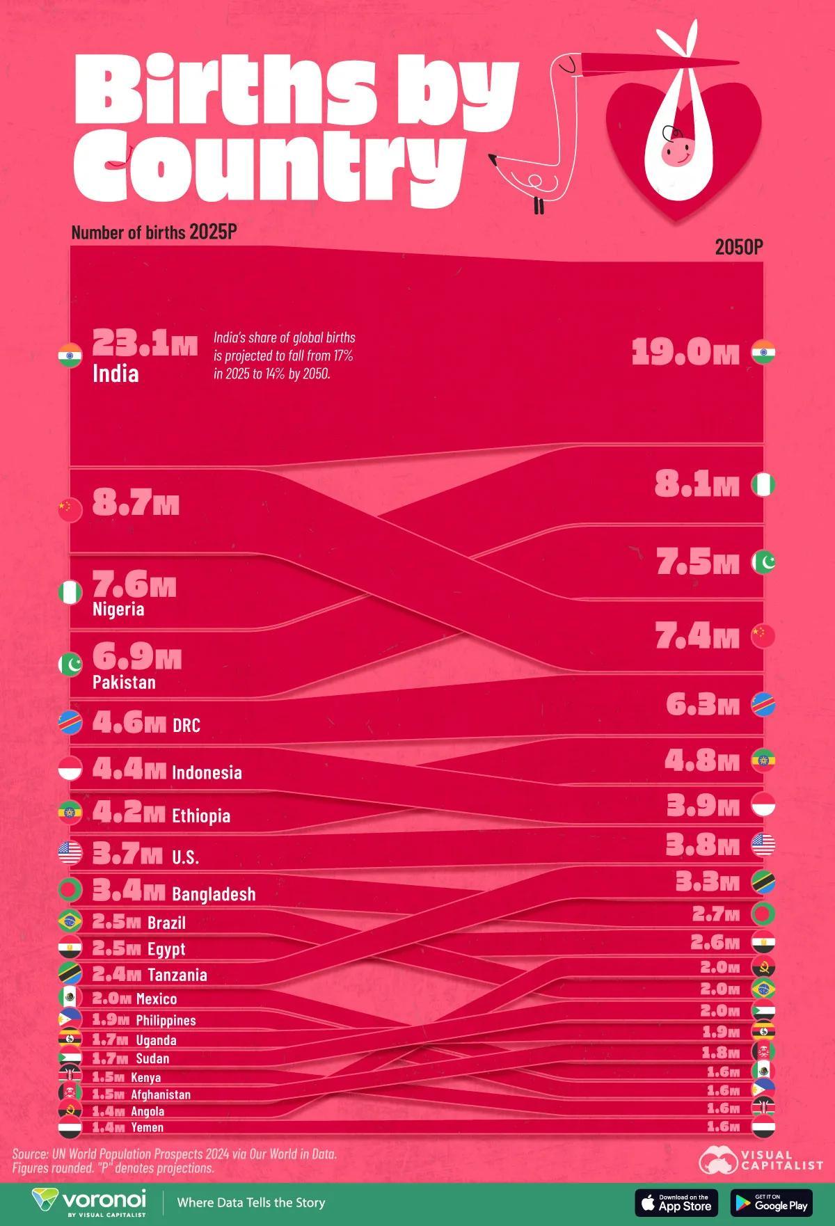 联合国人口报告预测,2050年中国人口出生少于尼日利亚、巴基斯坦之前发了2025年的人口出生预测,中国870万、尼日利亚760万、巴基斯坦690万。这个UN population预测,还说了2050年的数字,中国740万低于尼日利亚的810万、巴基斯坦的750万。甚至刚果(金)的630万也接近了。这种长期预测不容易搞,但联合国报告就会拿出一个基本假设,如生育率都在2050年变成2.0,就根据数学算出来了。直觉上,确实很难相信尼日利亚和巴基斯坦出生人口会多于中国。但如果仔细考虑细节,这种事是有可能的。现在20后就是2050年的生育主力,人数规模和尼日利亚、巴基是接近的。到时生育意愿再不一样,是有可能出生数字被超过。可能改变趋势的是两个事。一个是中国大力提升生育率,年出生人口又重新爬上1000万。一个是尼日利亚和巴基斯坦出现经济问题了,人们养不活小孩,生育率从4-5降低到2-3。如果这两国人口一直大幅增长,压力太大,弄不好出动乱。