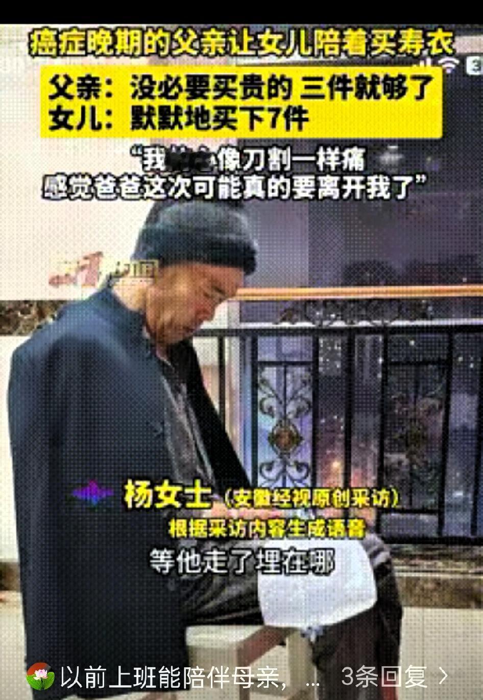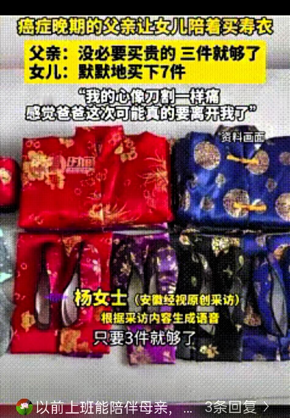 泪目了!刷到重庆杨女士陪父亲买寿衣的事,心里堵得慌,不是那种大哭大闹的难受,就是沉沉的,像压了块石头,很多人看了应该都会想起自己的爸妈。 杨女士的父亲三个月前查出来肝癌晚期,之后基本都在医院过,疼得扛不住了就打止痛针。 那天打完针,父亲精神稍微缓过来点,突然拉着她说:“闺女,陪我去买身寿衣吧。”杨女士没多问,默默搀着父亲出了医院,她心里清楚,父亲这是在悄悄安排身后事,难受却不敢露出来,怕父亲更担心。 到了寿衣店,父亲慢慢翻着架子上的衣服,跟店家轻声说:“不用拿贵的,也别要花哨的,三件就够了,多了没用,浪费钱。” 杨女士站在旁边,看着父亲瘦得颧骨都凸出来,手背上全是输液留下的针眼,心里酸得慌。她太了解父亲了,这辈子都节俭,到这时候,最惦记的还是别给她添负担。 趁父亲低头和店家说尺码的空当,杨女士悄悄拽了拽店家,指着父亲刚才多看了两眼的几件衣服,小声说:“这些,还有那件深颜色的,都帮我包上,一共七件。”她没敢让父亲看见,怕父亲又念叨她乱花钱,也怕自己忍不住掉眼泪。 回家的路其实就几百米,平时走几分钟,那天杨女士却觉得走了好久。她搀着父亲的胳膊,能明显摸到骨头,以前父亲的肩膀多宽啊,家里的重活累活都是他扛,现在却轻得好像一使劲就会碰疼。 路上父亲还在慢慢说:“我走了以后,别叫太多亲戚,别办酒席,太麻烦人,简单弄弄就行。” 杨女士只是嗯嗯应着,不敢多说话,怕一开口声音就抖,更怕父亲看出她的难过。她知道父亲的时间在倒计时,可真听他说这些,心里还是像被揪着一样疼。 我们总爱说“等以后”,等忙完工作就陪父母,等条件好了带他们出门,可父母的日子,哪有那么多“以后”。 他们一辈子都在为孩子打算,连临走前,想的还是别麻烦孩子、别浪费钱。其实父母要的真不多,不是多好的礼物,就是平时多打个电话,回家吃顿饭,耐心听他们说几句家长里短。 你有没有过这样的瞬间?可能是爸妈说“衣服够穿,别再买了”,可能是他们开始跟你说家里的钥匙放哪儿、存折在哪,那一刻突然就觉得,他们好像真的老了?