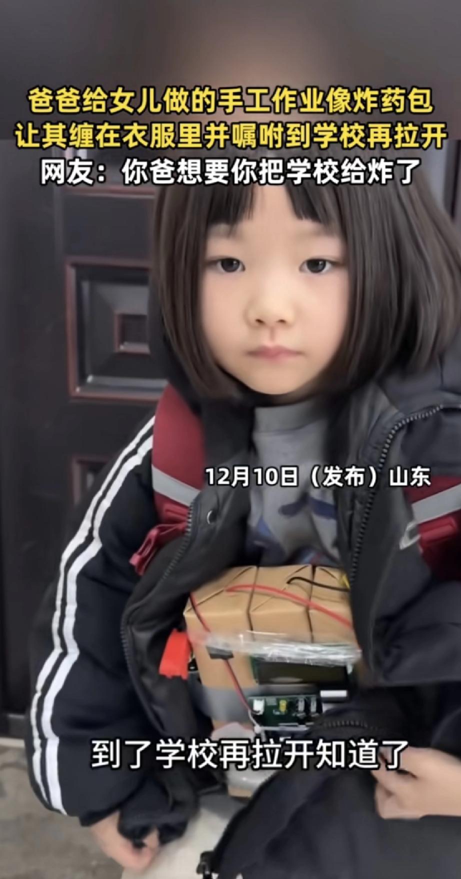 山东一位爸爸给女儿做手工作业,成品怎么看怎么像“炸药包”。他让女儿把东西缠在衣服里,还特意嘱咐:“到了学校再拉开。” 女儿乖乖照做,可这造型实在太像电影里的爆破装置了。网友一看笑疯了:“你爸这是想让你把学校给炸了吧?” 爸爸的手艺是认真的,就是这创意有点过于“硬核”了。