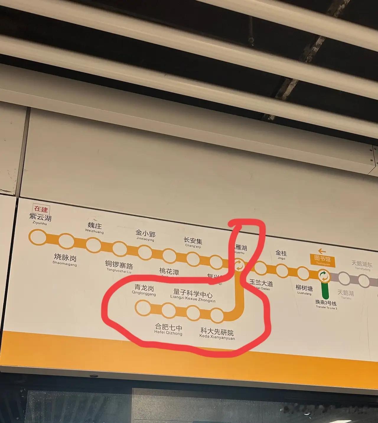 合肥地铁四号线原终点站是青龙岗站,后面搞了个延长线,其实是分叉线到了肥西紫蓬那边。现在那边反而成了真正的四号线。 一开始很多人坐合肥这个四号线就容易坐错。合肥的规划建设应该要更具前瞻性。