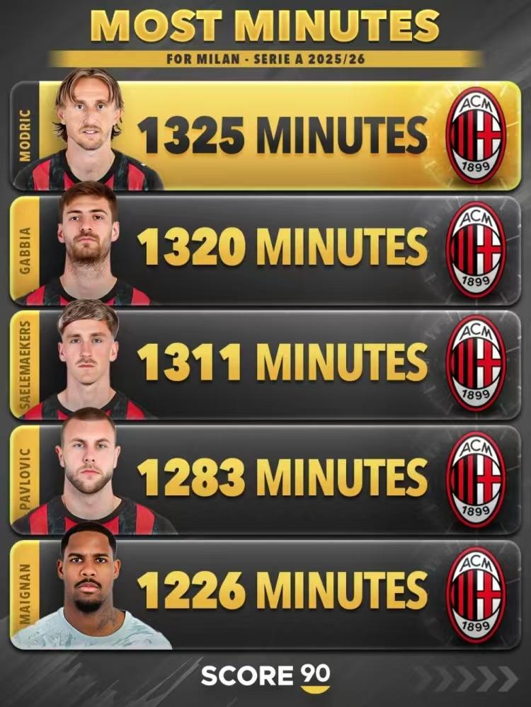 本赛季的米兰五大出场王都是谁? 本赛季米兰出场最多的5个球员分别是莫德里奇、加比