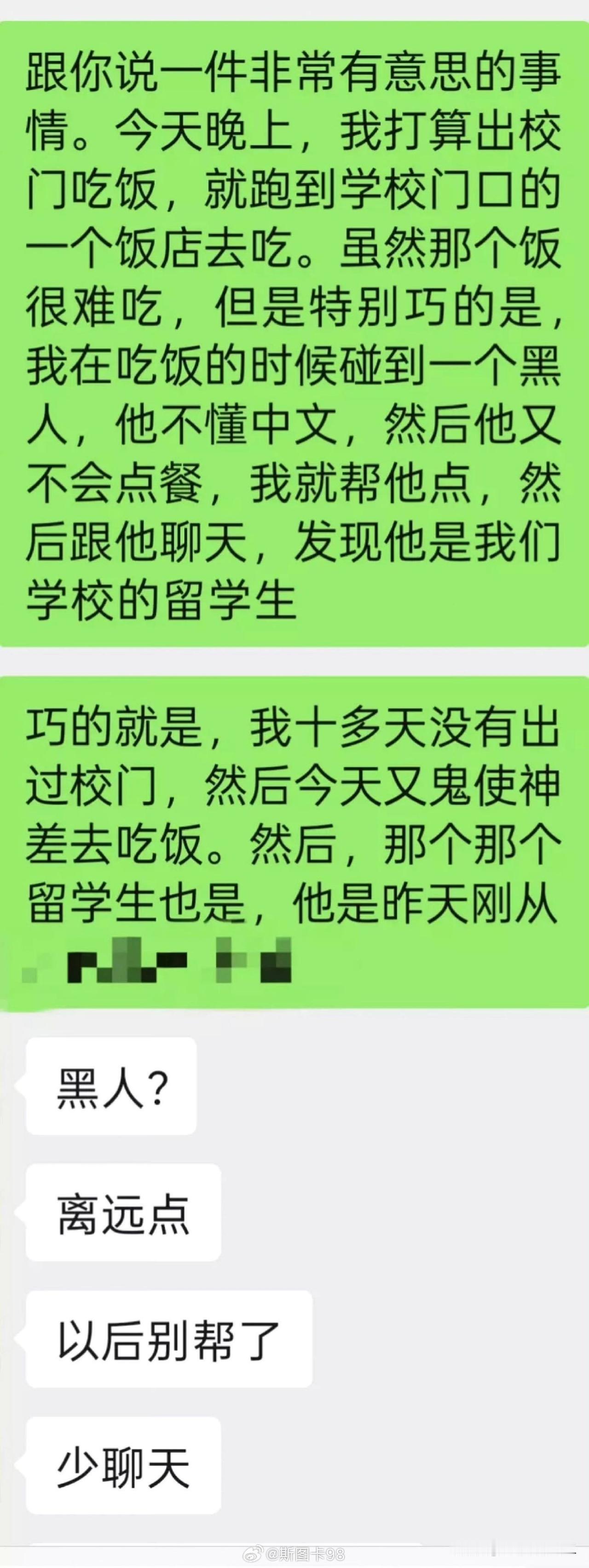 只是在饭馆吃个饭和H人碰个面,就加了微信,还要帮助他学汉语。男友让她删了,她还不高兴,男友没办法只能把她删了,你觉得男友这样做对吗? 一个女孩子在饭馆吃饭,第一次碰上外国人,就直接加了人家好友,你觉得这样做慎重吗?而且她还自述,十多天后再次去那个饭馆吃饭,又碰上了那个H人,这些难道都是巧合吗? 别怪男友神经质,也别怪人家删了你。人家只是不能接受这件事,换了你是她男友,会怎么办?