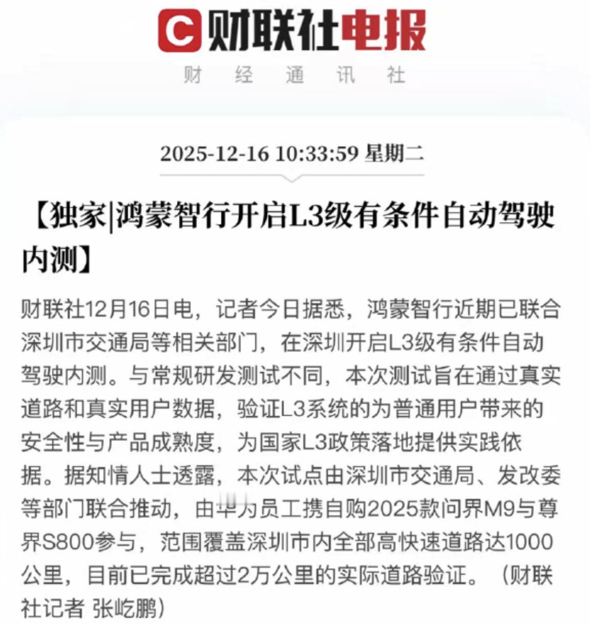 鸿蒙智行正在进行L3级有条件自动驾驶内测 据财联社报道,鸿蒙智行近期已联合深圳市交通局等相关部门,在深圳开启L3级有条件自动驾驶内测。与常规研发测试不同,本次测试旨在通过真实道路和真实用户数据,验证L3系统的为普通用户带来的安全性与产品成熟度,为国家L3政策落地提供实践依据。据知情人士透露,本次试点由深圳市交通局、发改委等部门联合推动,由华为员工携自购2025款问界M9与尊界S800参与,范围覆盖深圳市内全部高快速道路达1000公里,目前已完成超过2万公里的实际道路验证。