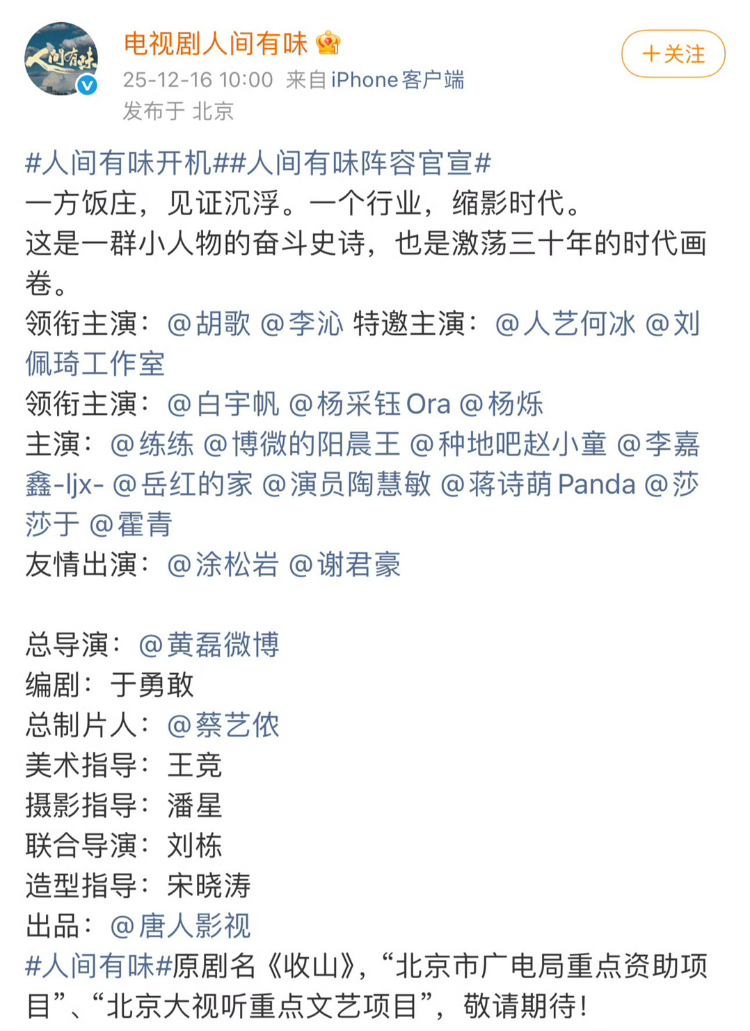 《人间有味》官宣胡歌李沁主演!导演是黄磊黄老师!期待喽!