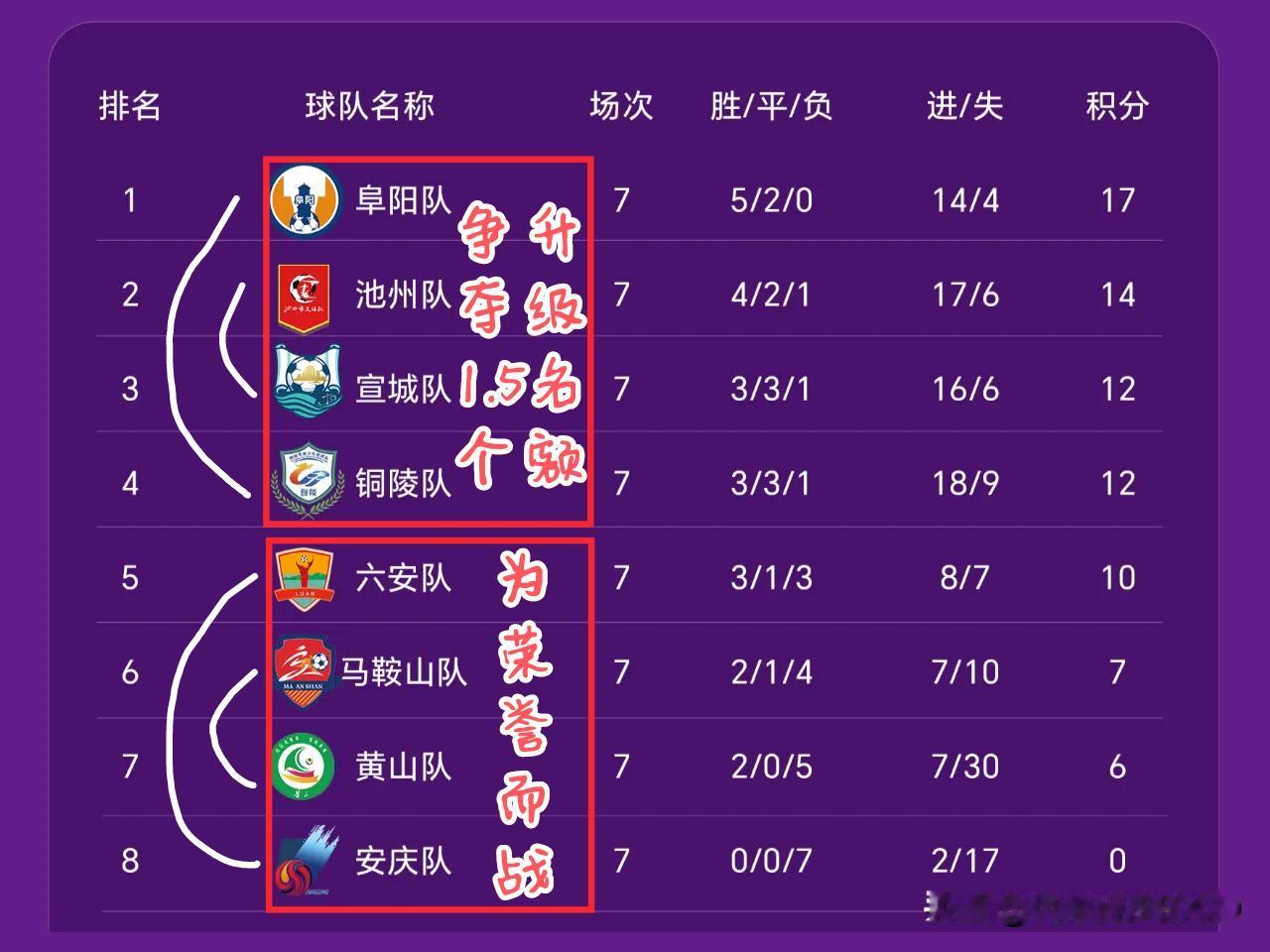 安庆:省会都失去过,没有什么不好再失去的!不慌! 倒数第一不降级,明年接着踢...看懂规则,不要吓自己! 徽青赛小组循环赛已结束,目前排名不代表最终排名,要等到明年3月份的排名争夺赛结束才能盖棺定论。 参照竞赛办法第四条第2条若干规则,对于目前倒数第一的安庆队而言,今年升级甲组已经100%不可能,因为那是前4名的事情,想要摆脱垫底的尴尬境地,5-7名仍需要后面的比赛去争取。 接下来的赛程很明晰:还有4场比赛,先在主场踢六安,再去客场进行二番战。赢了,和马鞍山/黄山的胜者踢2场,争夺第5名;输了,和马鞍山/黄山的败者踢2场,争夺第7名。 纯粹是瞎操心,这种比赛输赢都无所谓,图一个乐呵...欢迎大家对此评论、交流。 安徽身边事 徽青赛 提到安徽,你首先想到的是什么 历史上安徽省会城市换过几次
