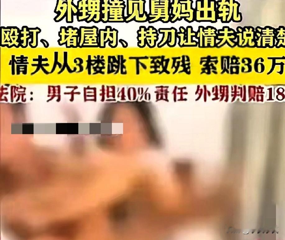 云南玉溪,外甥跟36岁舅妈同时被抓,舅妈情人坠楼身亡 江西一务工男与36岁女子发展成情人关系,14日中午两人在房间内,做着男需女要之事,被突然冲进门的女子外甥撞见,外甥用刀对男子恐吓,男子在慌乱中想越窗逃走时,不慎从三楼跌落身亡, 法院判决:外甥用刀挟持恐吓死者,造成死者过激行为导致坠楼身亡负主要责任,36岁女子在现场没有阻止导致悲剧发生,负次要责任,,死者男子自负少部分。