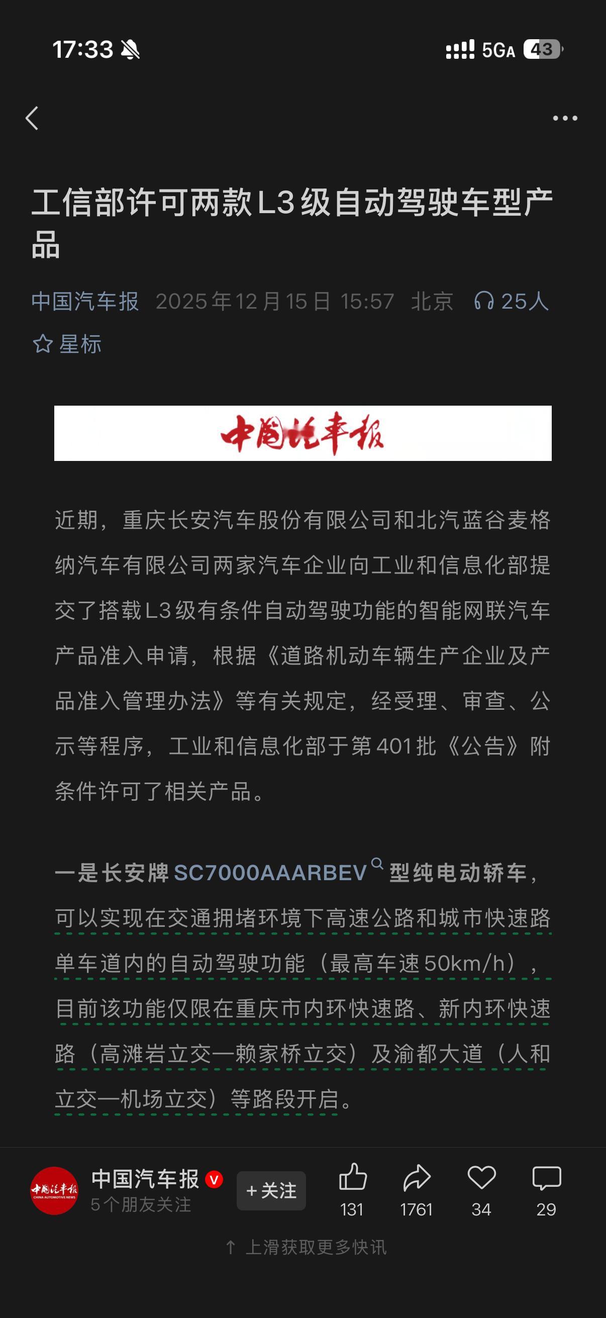 我国首批L3自动驾驶车型获准入许可其中一辆是长安牌SC7000AAARBEV仅限