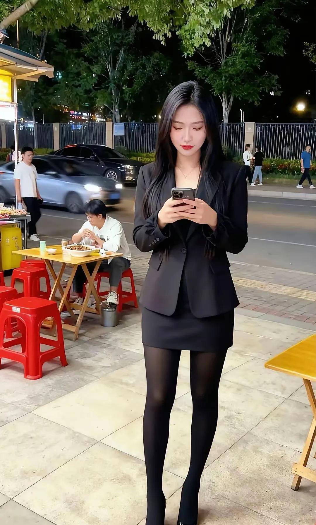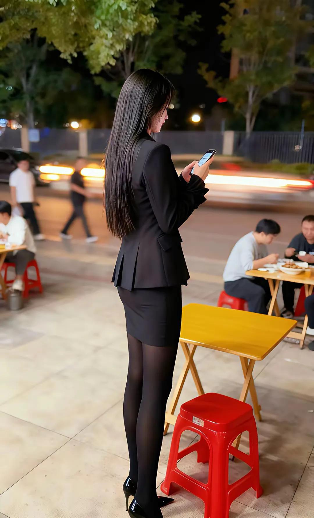 都市夜晚的街头,优雅白领低头看手机,街边小吃摊灯火通明。