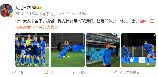赛后,王霜在微博晒出照片并写道:“今年大家辛苦了,感谢一路支持女足的球迷们。让我们休息,休息一会儿。”