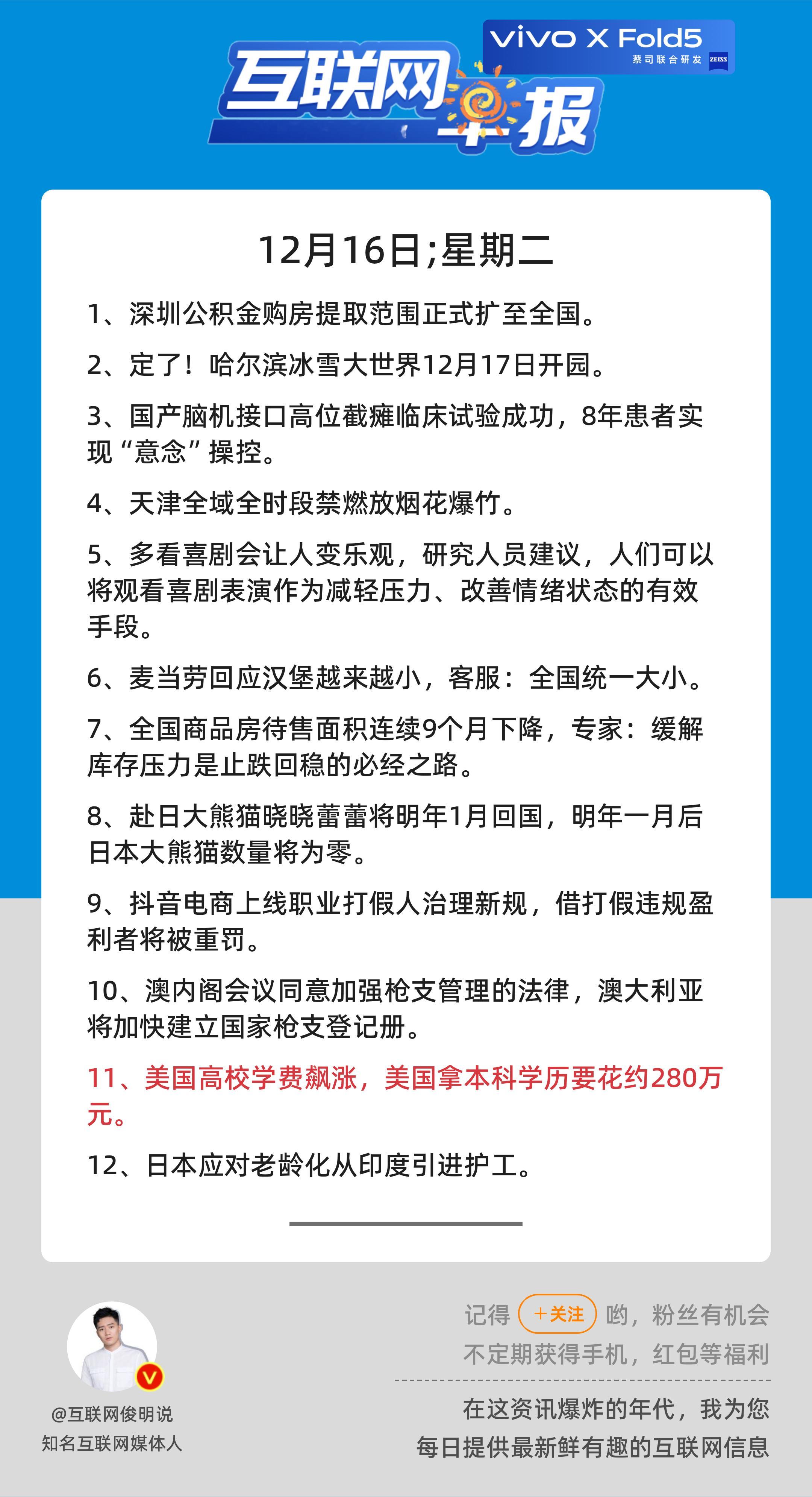 12月16日,星期二,《第2989期》;互联网早报,众览天下事关心第11条:美国高校学费飙涨,美国拿本科学历要花约280万元;早安————————————点击右上方关注每天一分钟众览天下事,互联网早报值得拥有! 更多精彩,欢迎加入粉丝群俊明和他的朋友们