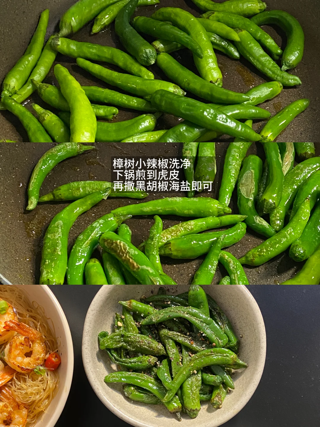 樟树小辣椒洗净,下锅煎到虎皮,再撒黑胡椒海盐即可