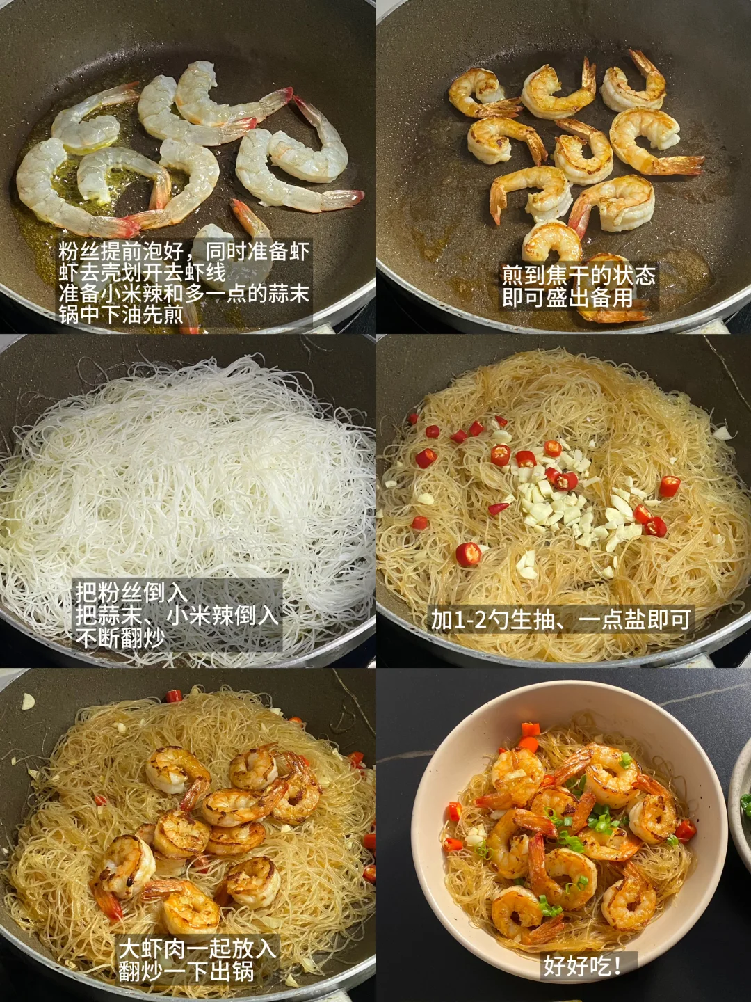 3)把蒜末、小米辣倒入,再把粉丝倒入不断翻炒,加1-2勺生抽、一点盐即可,大虾肉一起放入翻炒一下,出锅