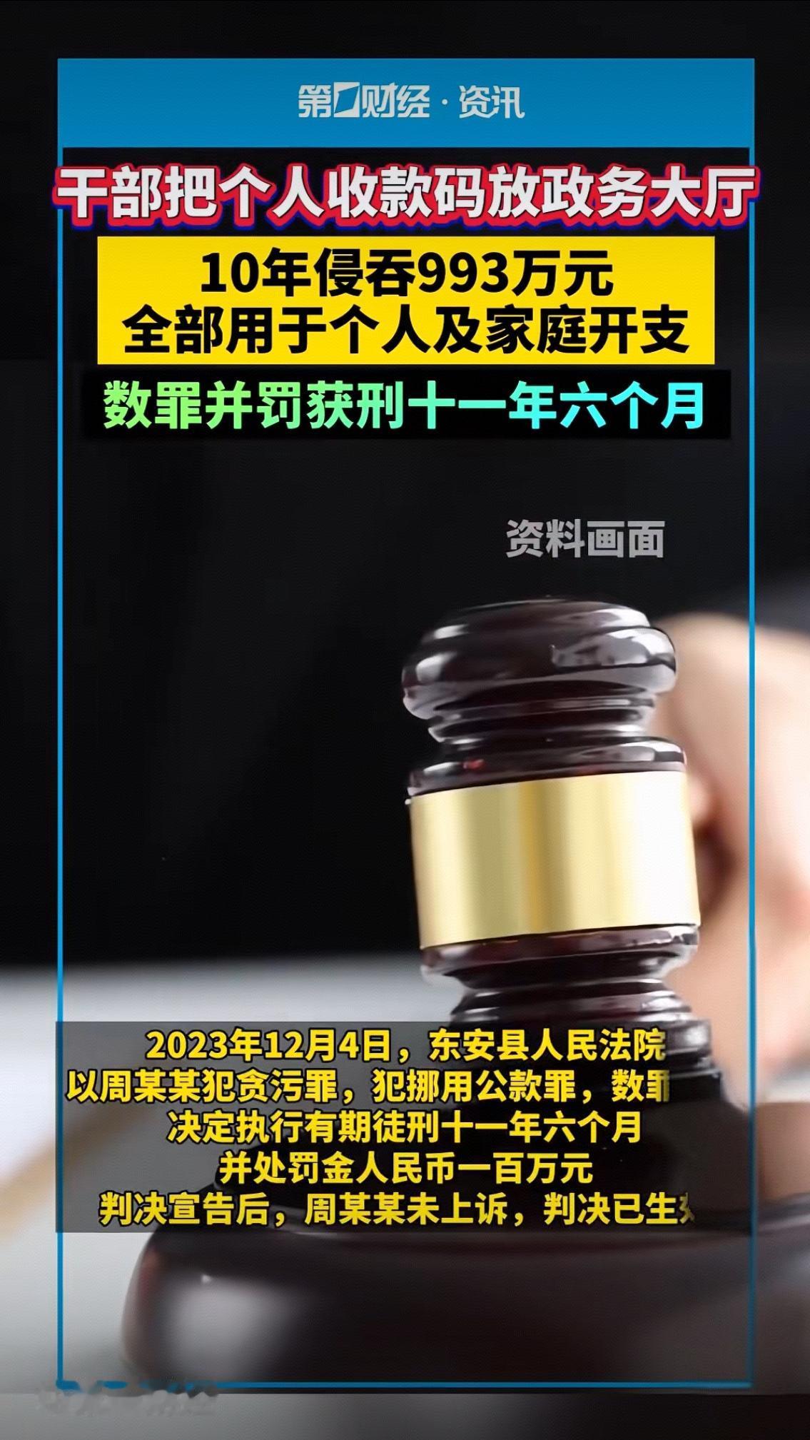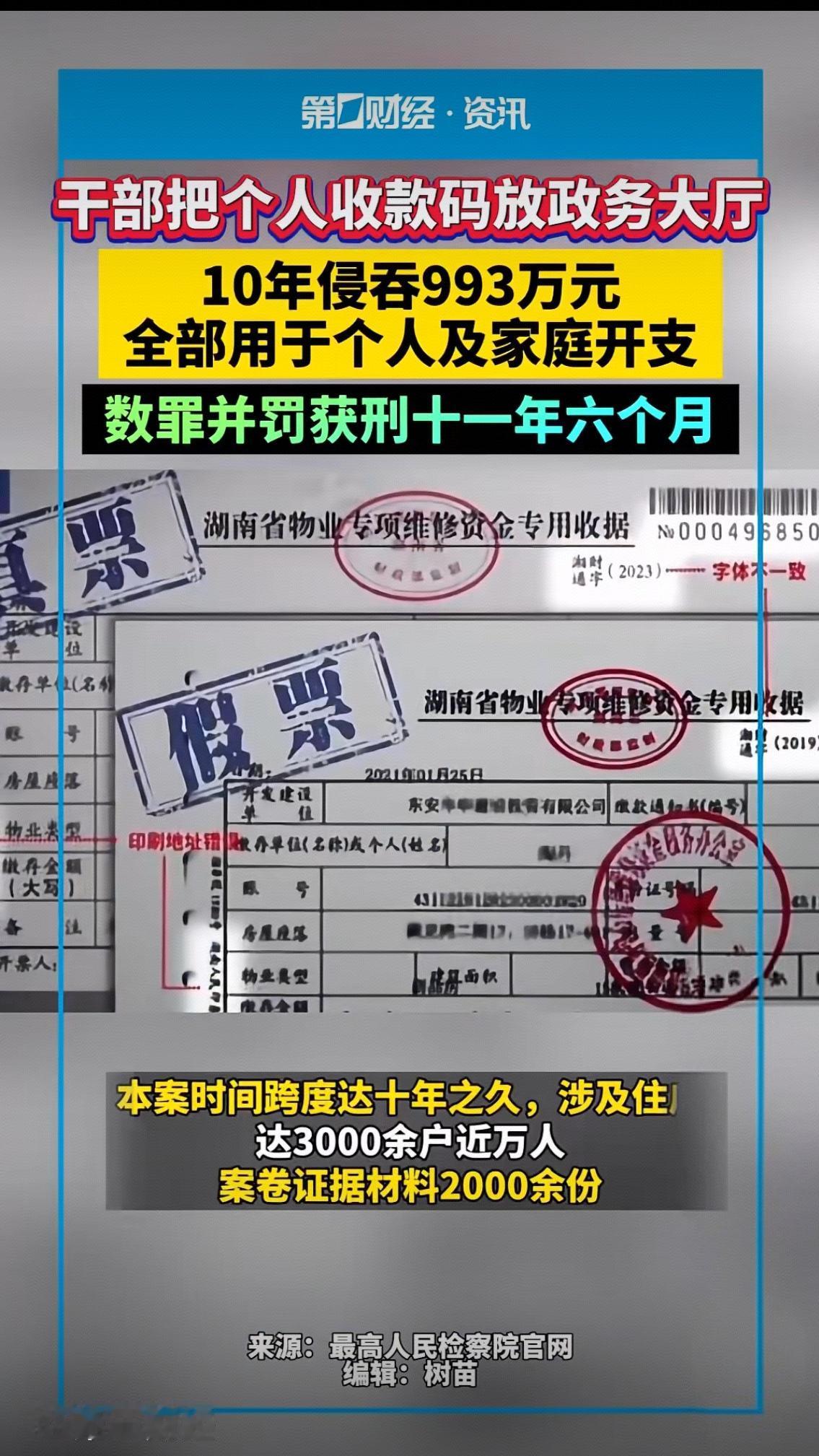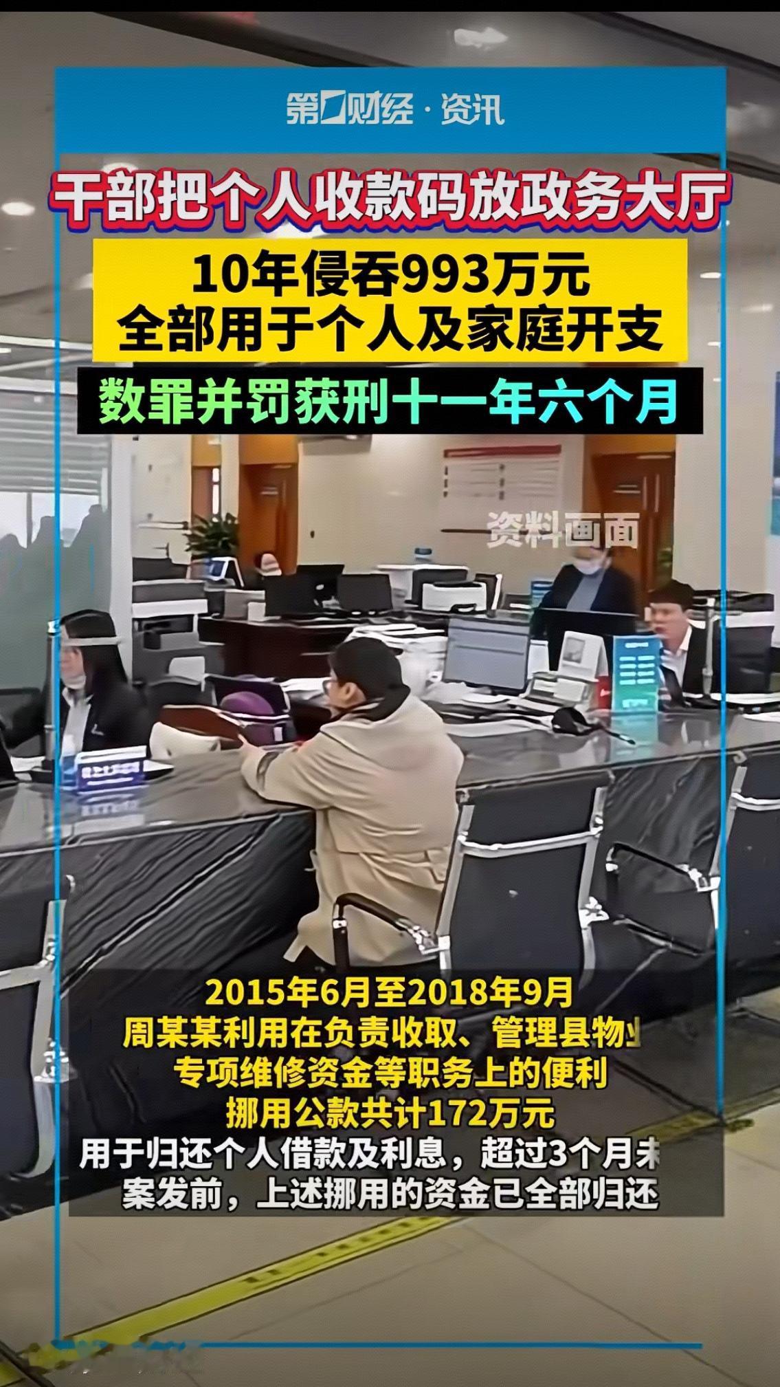 政务大厅摆个人收款码,10年贪993万!这起贪腐案的漏洞比赃款更刺眼 12月9日,“两高”发布的典型案例里,湖南某县周某某的贪腐案让全网炸了锅。身为住房保障服务中心干部,他竟敢把个人收款码公然摆在政务大厅缴费窗口,十年间狂吞993万物业专项维修资金,还挪用172万还私债,最终获刑十一年六个月,罚百万罚金。更让人咋舌的是,这近千万赃款全被他用来买房、挥霍,撑起了自己的奢华生活,而背后是3000余户近万名业主的住房安全保障打了水漂。 说出来你可能不信,周某某的作案手法简单到离谱。2012年到2022年,他靠着职务便利,让来交维修资金的群众直接扫他的个人收款码,再用手写白条、虚假收据糊弄了事,把本该进公家账户的“救命钱”直接揣进腰包。要知道,物业专项维修资金是房子的“养老金”,电梯坏了、外墙漏了、水管裂了,全靠这笔钱应急。可周某某却把它当成自己的提款机,一边是群众按规定缴费盼着住房安全,一边是他拿着民脂民膏过奢侈日子,这种反差简直让人怒不可遏。 更让人脊背发凉的是,如此明目张胆的操作,居然能瞒天过海十年。直到2022年底,有小区电梯因缺维修资金停运,业主们集体追问才揭开真相。这十年里,开票系统和财务系统没联网,资金流向没人查,日常核查、审计全是走过场,本该层层把关的监管链条彻底失效。难怪网友吐槽:“不是他手段高明,是监管睁一只眼闭一只眼,让公权力成了他的私产。” 案发后,周某某试图用假离婚转移财产逃避追责,可最终还是被司法机关追回1062万涉案财产,11名失职人员也被追责问责 。当地开展专项整治、完善监管制度,算是给群众一个交代。但这起案件留下的思考远没结束:政务大厅是为民服务的窗口,怎么就成了贪腐的温床?如果早一点堵住监管漏洞,早一次认真核查,何至于让贪腐持续十年? 其实,群众怕的从来不是严格缴费,而是缴的钱被人中饱私囊;恨的也不只是贪官的贪婪,更是监管缺位带来的不公。好在正义从不会缺席,周某某的下场是咎由自取,也给所有公职人员敲响警钟:公权力姓公不姓私,任何想动群众“钱袋子”的人,终将付出惨痛代价。 你怎么看这起“收款码贪腐案”?是觉得惩罚够重,还是认为监管漏洞更该严查?欢迎在评论区聊聊你的看法!湖南基层腐败案