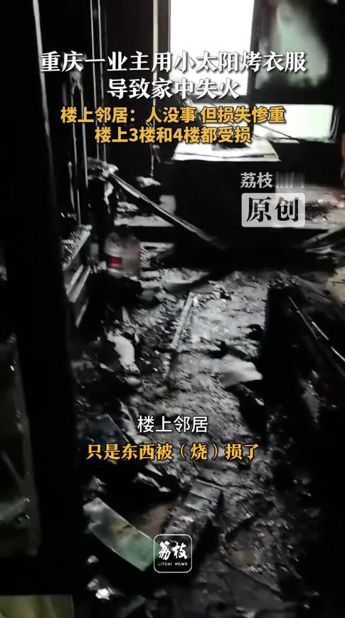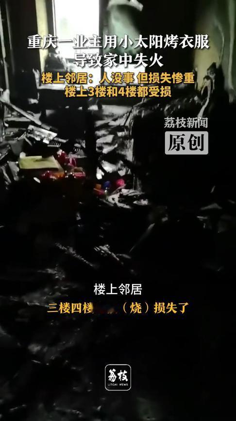 “悲剧还是发生了!”12月12日,重庆,一女子晚上睡觉时,突然感觉呼吸困难,打开灯后发现屋内全是烟,最终发现是楼下起火了!原来,邻居用小太阳烤衣服,结果睡觉时忘记了,最终引发了火灾。网友:心怎么这么大! 现在的天气一天比一天凉,洗衣机烘干过的衣服,也要等上好几天才会干,有些人为了图方便,可能会用烘干机或者小太阳烤衣服,可是在使用过程中一定要注意安全。 当天晚上,二楼的业主洗完衣服后,担心第二天干不了,就搬来小太阳放在阳台,对着潮湿的衣服炙烤。 由于等待的过程太无聊,业主便回到卧室休息了,结果却把烤衣服的事忘得一干二净,小太阳就这么开了一晚上,最终设备发生了短路,引发了火灾。 业主半夜突然惊醒,救火已经来不及了,只能尽快逃到外面拨打消防电话,与此同时,楼上的邻居也感觉家里不对劲,不仅变得异常暖和,还被烟呛得直咳嗽。 意识到情况不对劲后,大家争先恐后的撤到外面,最终大火被消防员扑灭,但损失却也非常明显。 二楼的业主不仅要重新装修,还要赔偿楼上的几户邻居,这下子又得几十万砸进去! 网友看后表示,这回真是长教训了,使用这种取暖设备时,一定不能长时间没有人在一旁,不然一旦发生意外,想要救火都来不及。 信息来源:《12月12日,重庆。网友发帖称,楼下邻居用小太阳烤衣服导致家中失火损失惨重,邻居称人没事,但是损失不小。》第一现场
