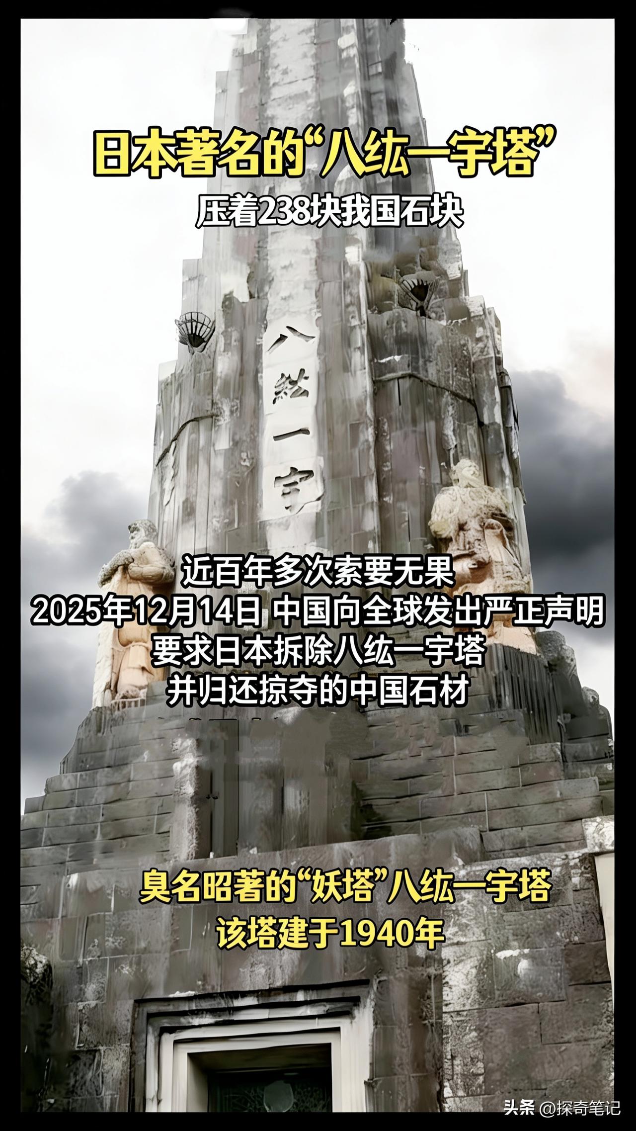 1940年,日本在宫崎县建起一座36.4米高的石塔,名叫“八纮一宇”。这塔基座里塞了370多块从别国抢来的名贵石头,其中238块来自中国。南京被抢走的就有4块,包括明故宫的麒麟浮雕石——它是在南京大屠杀发生一年多后,被日本人硬生生抢走的。 这块刻着“南京”二字的麒麟石,本该守在故乡,却成了侵略者的“战利品”。战后日本没拆塔还石头,反而把塔名改称“和平之塔”,想抹掉历史。1965年他们甚至恢复“八纮一宇”字样,还把这里当成旅游点、奥运火炬传送起点,简直是把别人的伤痛包装成自己的体面。 2015年,南京民间人士曾去日本要求归还石头,对方却以“维持现状”搪塞。至今,一块石头都没回来。在我看来,这座塔就像一块顽固的伤疤,提醒人们:有些罪证还在阳光下摆着,有些人还欠着还不起的债。
